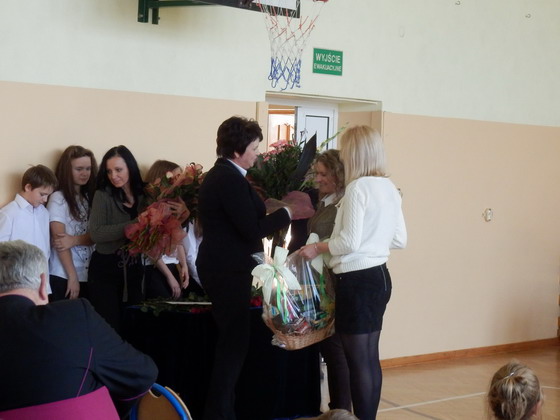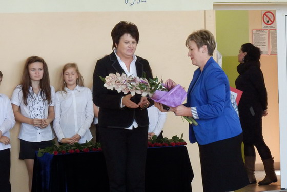 Rada Rodziców wręcza na ręce pani dyrektor upominek dla nauczycieli, życząc wszystkiego najlepszego