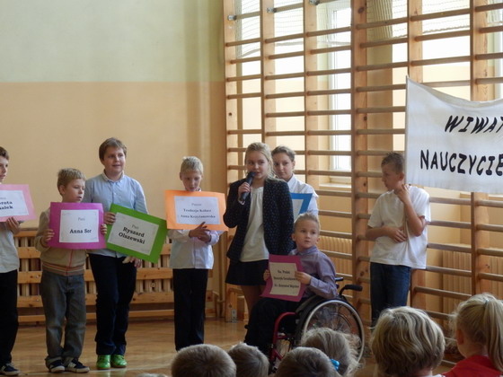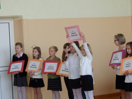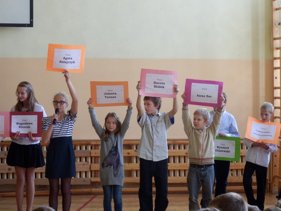 Uczniowie klasy czwartej i piatej od lewej: Julia Wójcik, Martyna Koźbiał, Gabriela Wasilewska, Julia Wójcik, Izabela Redlisiak, Joanna Łukasiewicz, Paulina Zając, Kacper Stusiński, Aleksandra Bałut, Weronika Orzechowska, Julia Borowska, Sylwia Żaczkiewicz, Patrycja Tomaszewska, Natalia Wróblewska, Michał Wiśniewski