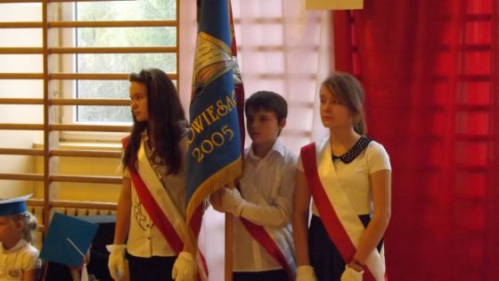 Poczet sztandarowy: Kornelia Sor, Michał Okrasa, Paulina Ziarkowska uczniowie klasy VI