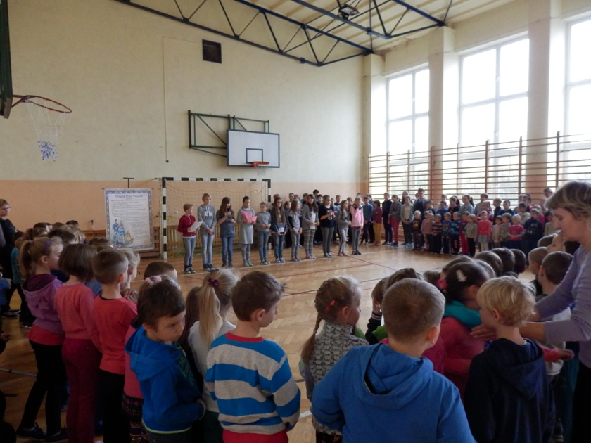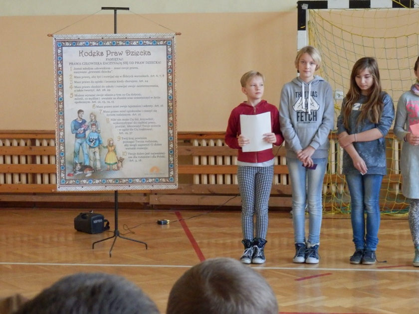 20 listopada w naszej szkole, odbył się apel poświęcony Ogólnopolskiemu Dniu Praw Dziecka. Dzień ten, na wniosek Rzecznika Praw Dziecka, został uchwalony przez Sejm Rzeczypospolitej Polskiej w dniu 7 listopada br. Ustanowienie takiego dnia, ma uświadomić dzieciom, iż mają swoje prawa i powinny wiedzieć , jak z nich korzystać, a dorosłym ma przypomnieć, że mają tych praw zawsze przestrzegać. Historię tego dokumentu przedstawiły uczennice klasy V. Dziewczęta omówiły także prawa dziecka. Uczniowie po apelu rozeszli się do klas , gdzie wraz w wychowawcami kontynuowali rozmowy o prawach i obowiązkach dzieci.