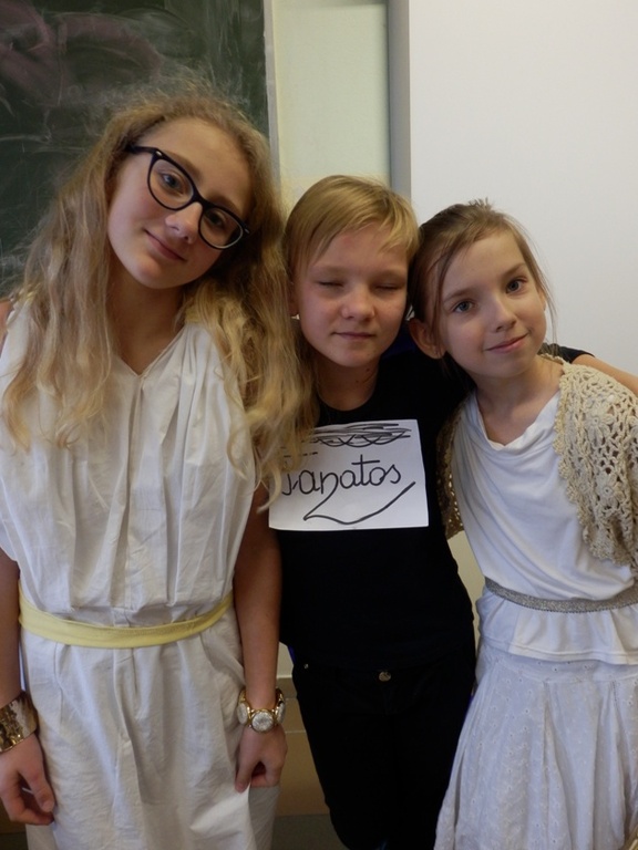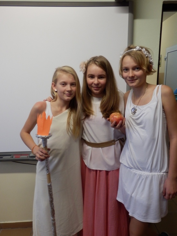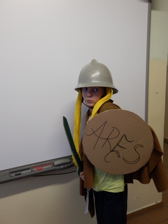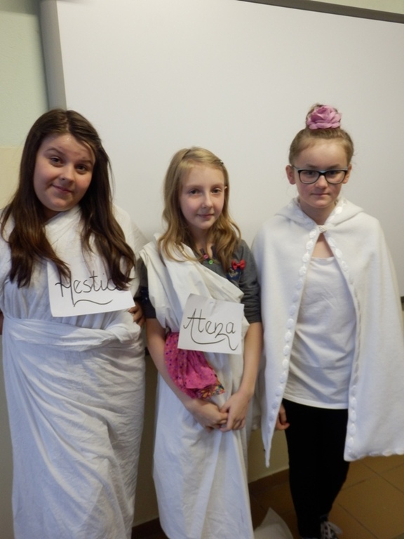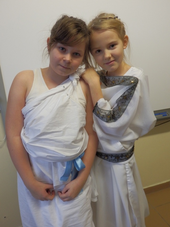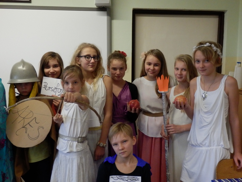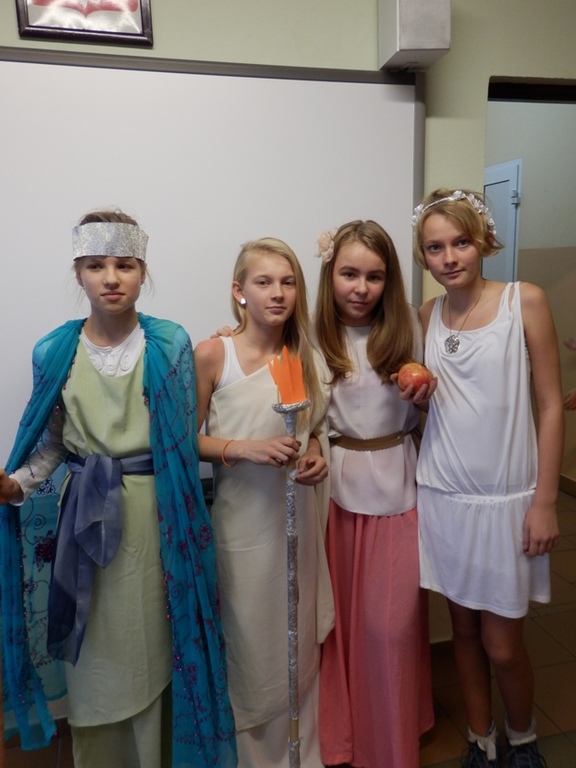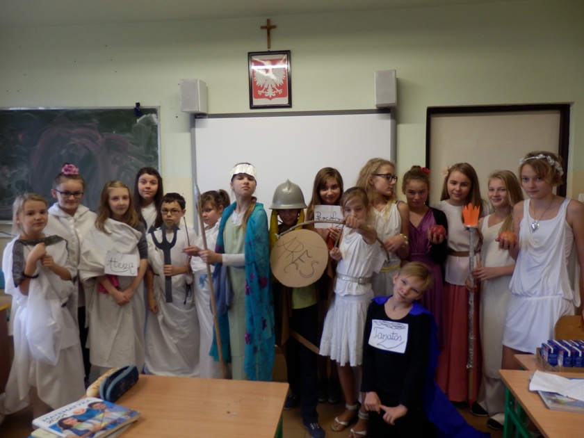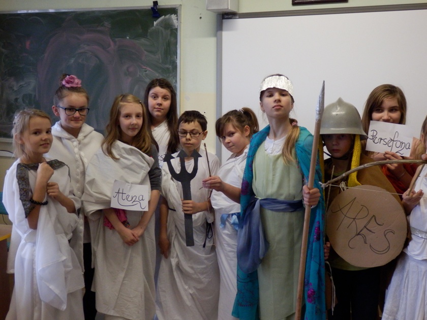 Czwartek 27 listopada był w naszej szkole niezwykle barwnym dniem, albowiem można było spotkać na przerwach boginie i bogów strarożytnej Grecji. Stało sie tak dzięki polonistce pani Teresie Zwierz, która wraz z uczniami klasy V przygotowała DZIEŃ MITOLOGICZNY. Ta forma utrwalenia wiadomości o MITACH GRECKICH dała dzieciom wiele radości i satysfakcji.