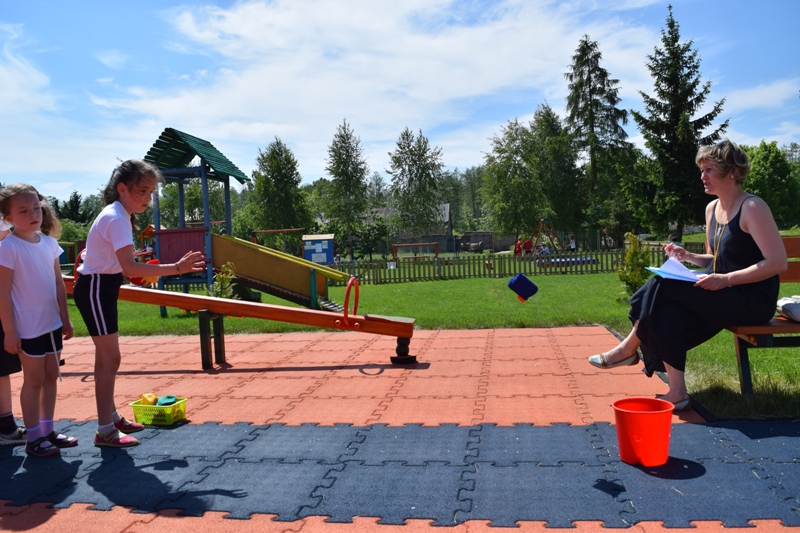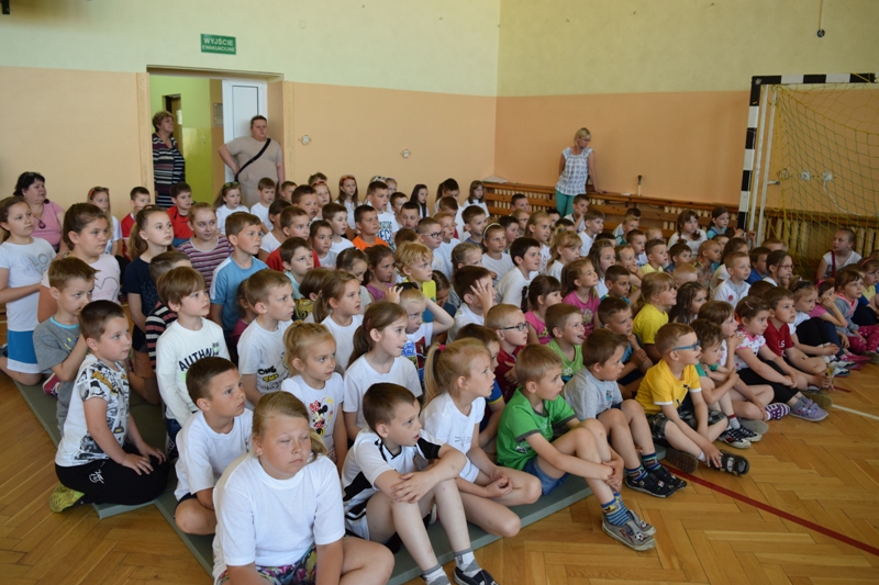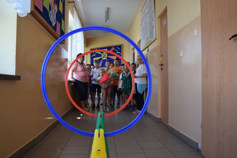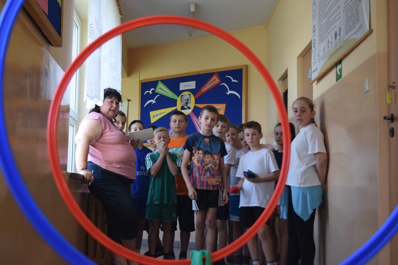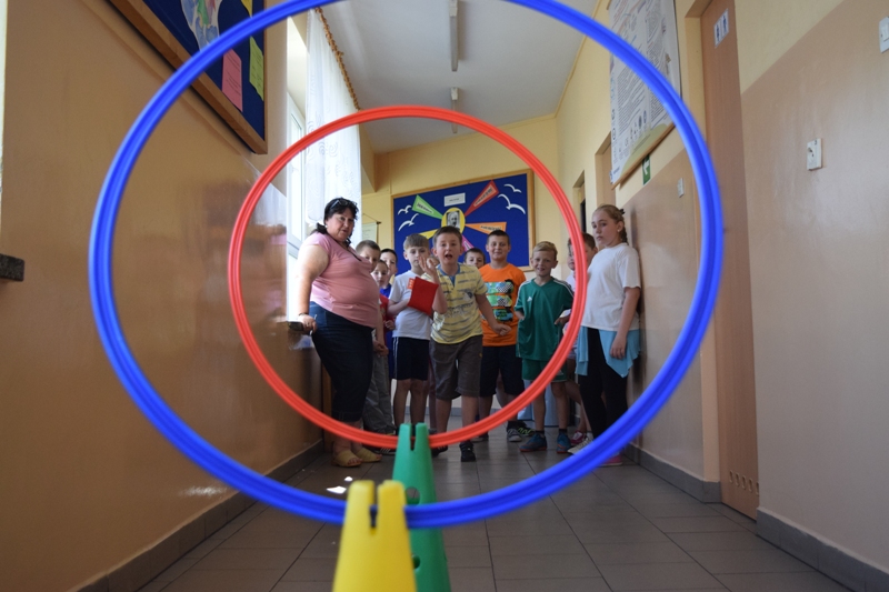 Nie mniej radości przeżyli uczniowie klas IV - VI, którzy wzięli udział w obchodach Gminnego Dnia Sportu zorganizowanym przez Publiczne Gimnazjum im. ppor. pil. Mariana Bełca w Jeruzalu. Na pięknym nowoczesnym boisku w otoczeniu bujnej roślinności uczniowie Szkoły Podstawowej im. K. Makuszyńskiego w Kowiesach, Niepublicznej Szkoły Podstawowej w Turowej Woli i Gimnazjum im. ppor. pil. Mariana Bełca w Jeruzalu rozegrali wiele pasjonujących konkurencji sportowych: rzut do kosza- 3 piłki, bieg płetwonurka, skok w dal, torowy rower, slalom piłkarski, wyścig z taczką. Odbył się również rajd rowerowy, piesza wycieczka z kijkami nordic warling, wspólny taniec zumby. Chociaż zawodnikom dokuczał upał nie ostudziło to ich sportowego zapału. Zmęczeni ale szczęśliwi chętnie skorzystali z przygotowanego posiłku, a mianowicie grochówki i kiełbaski oraz pączka nie zabrakło również wody z cytryną. Najbardziej upragnionym momentem była loteria. Nagrodę główną voucher na rower górski wygrał Aleksander Wacławek z klasy V, zaś Przemysław Telutki uczeń klasy VI wylosował tablet. Niezwykły Dzień Sportu na długo zapadnie w pamięć naszym uczniom.