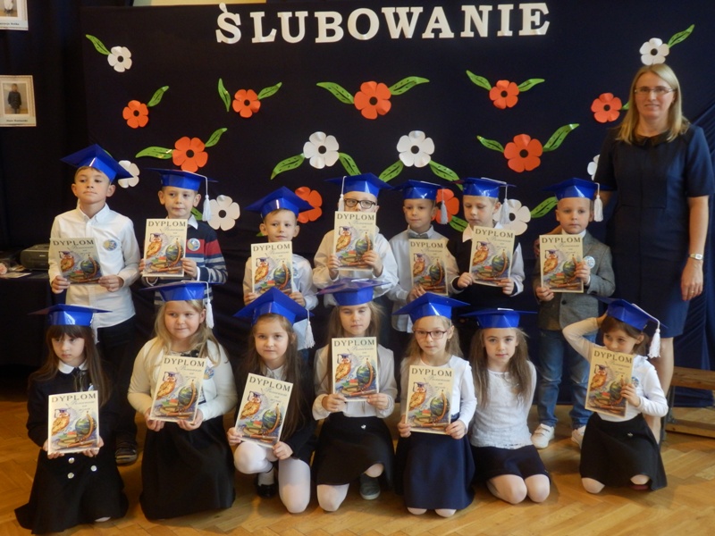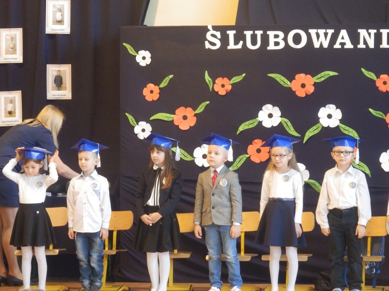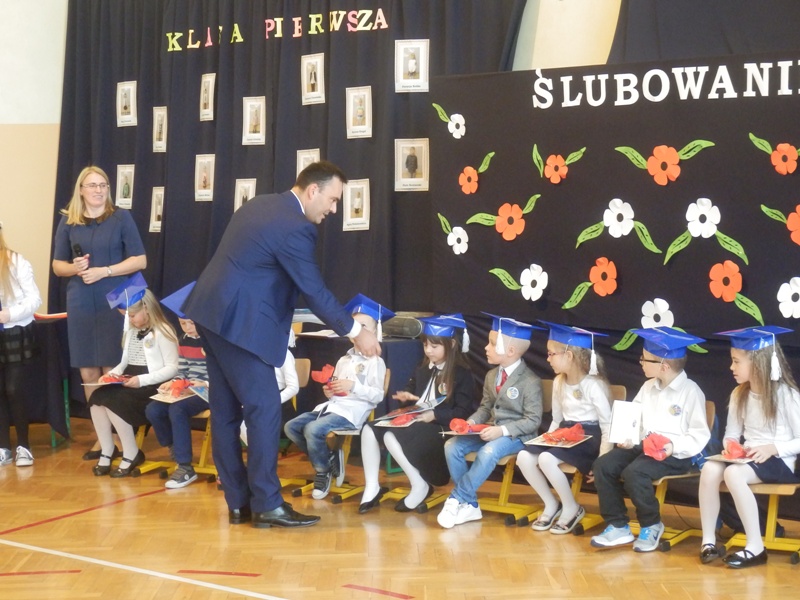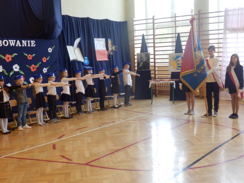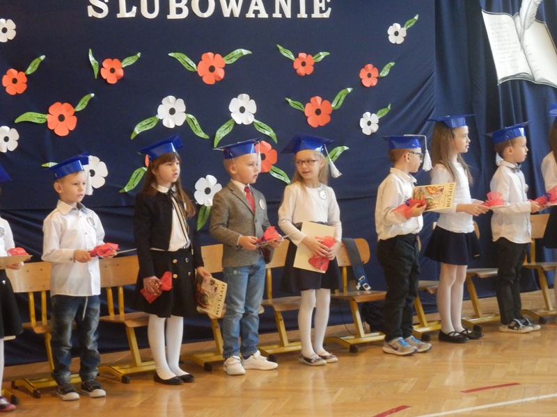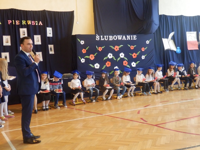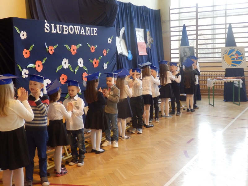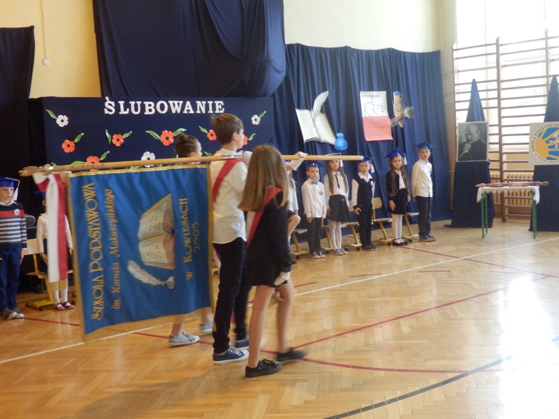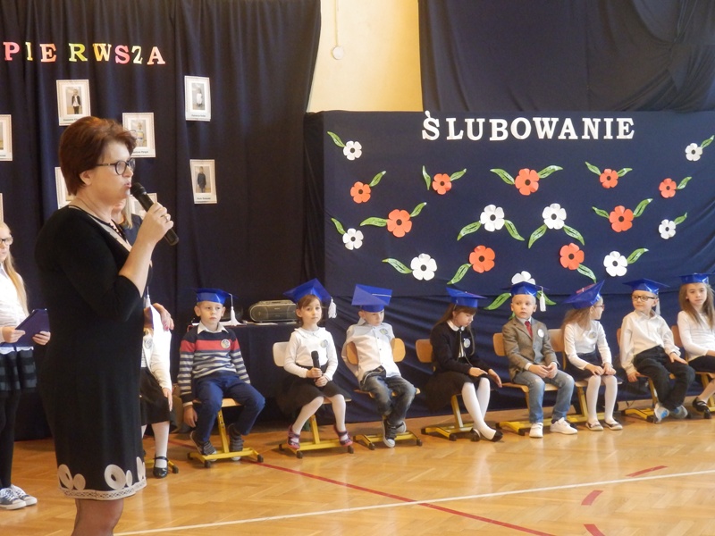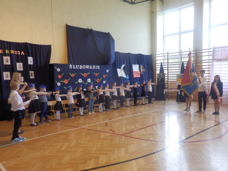 Następnie w niezwykle podniosłej atmosferze, przed pocztem sztandarowym czternastu pierwszaków ślubowało być dobrymi uczniami i Polakami, dbać o honor swojej klasy i szkoły a swym zachowaniem i nauką sprawiać radość rodzicom i nauczycielom.