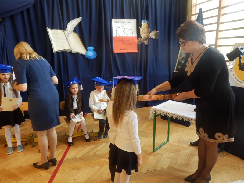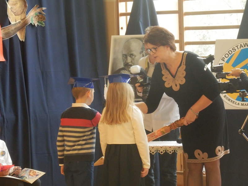 Po złożeniu ślubowania pani dyrektor dokonała pasowania na ucznia wypowiadając zdanie: „Pasuję Cię na ucznia Szkoły Podstawowej im. Kornela Makuszyńskiego w Kowiesach” i dotykając wielkim ołówkiem ramion pierwszoklasistów. Potem każdy pierwszak otrzymał pamiątkowy dyplom, legitymację oraz prezent ufundowany przez rodziców. Miłą niespodzianką dla dzieci były upominki od pana Wójta Gminy Kowiesy, który obdarował je książeczkami.