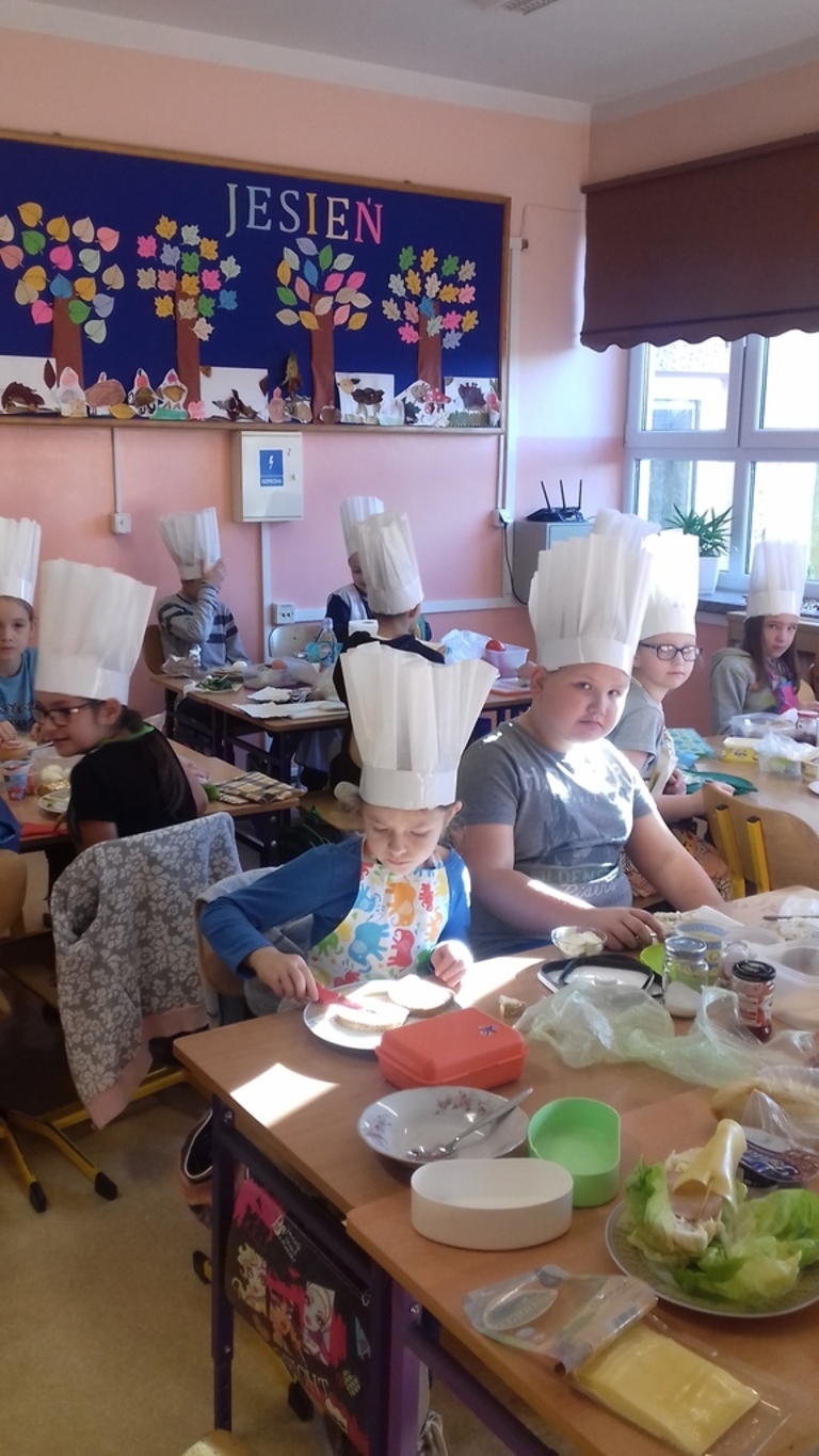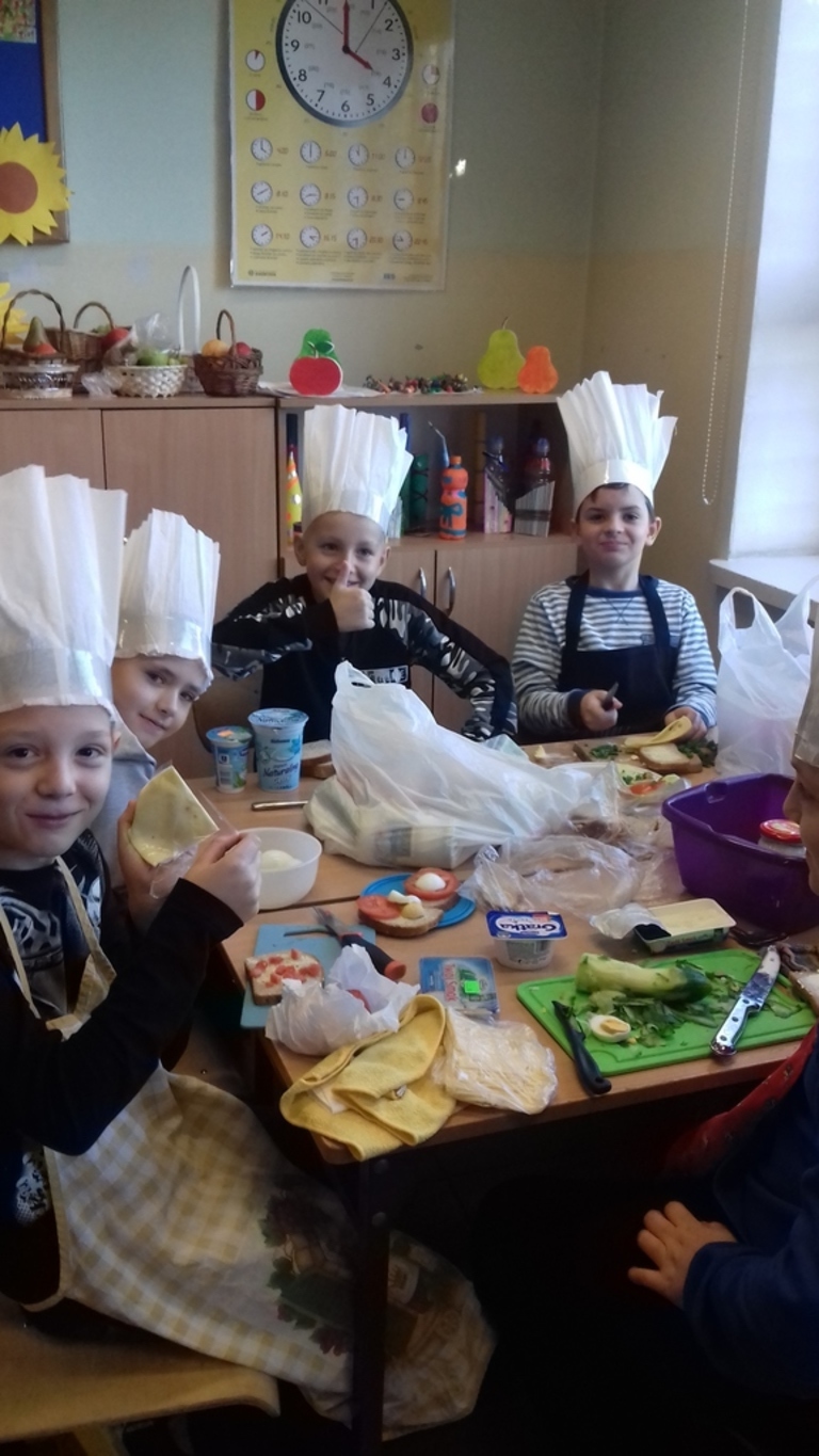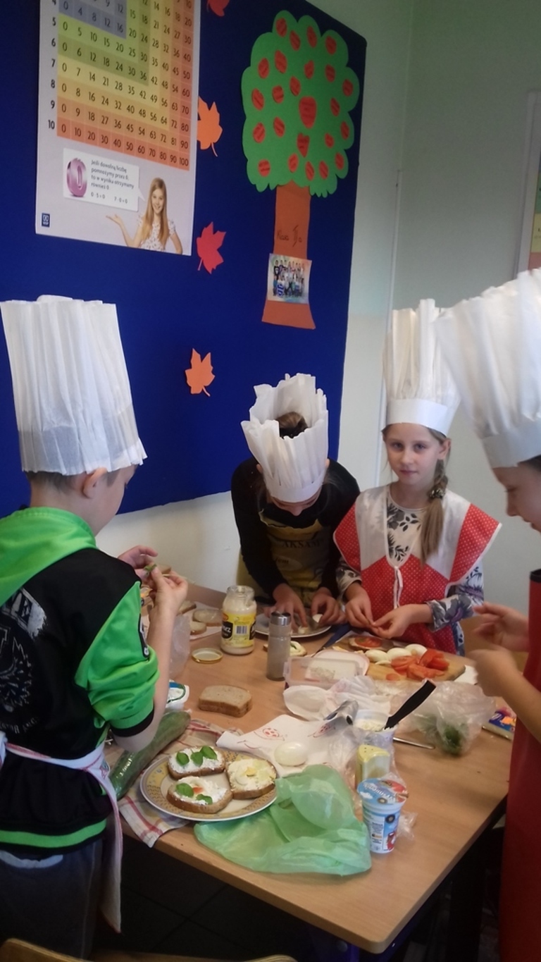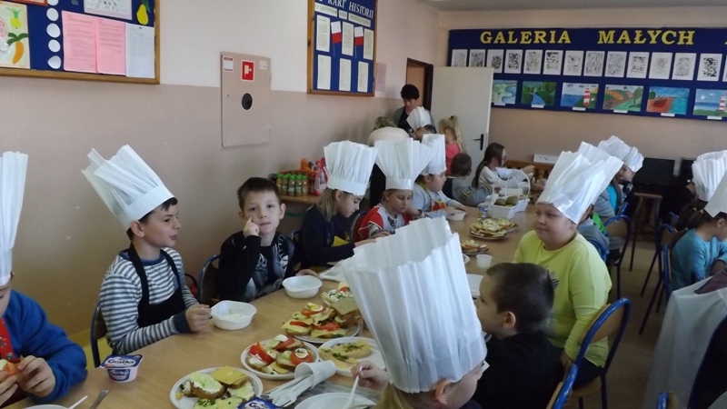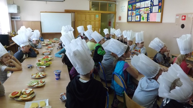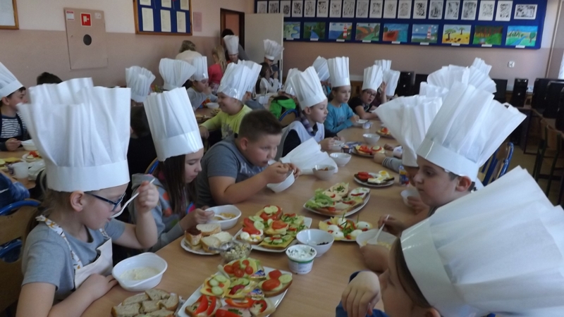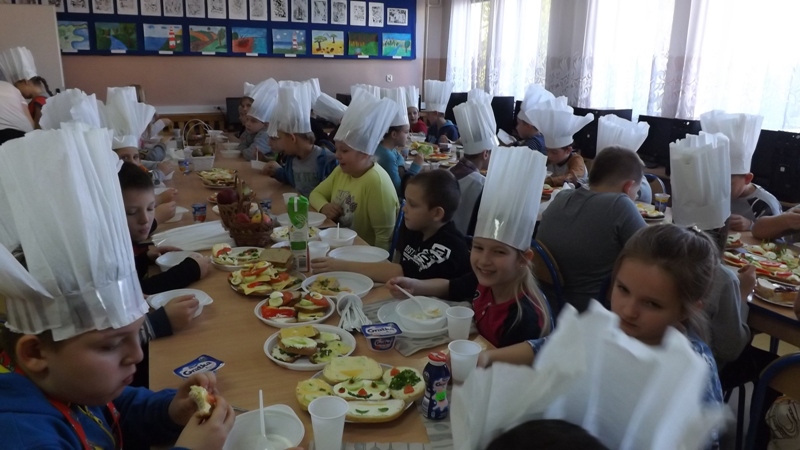 Wcześniej przeprowadzono w klasach pogadanki na temat roli śniadania, jako najważniejszego posiłku w ciągu dnia. Uczniowie poznali 12 zasad zdrowego odżywiania. Ważne jest , by jeść pięć posiłków w ciągu dnia o stałych porach i bez pośpiechu, systematycznie sięgać po nabiał, ryby, chleb zamiast bułek, a także picie wody czy soków, zamiast szkodliwych napojów gazowanych.