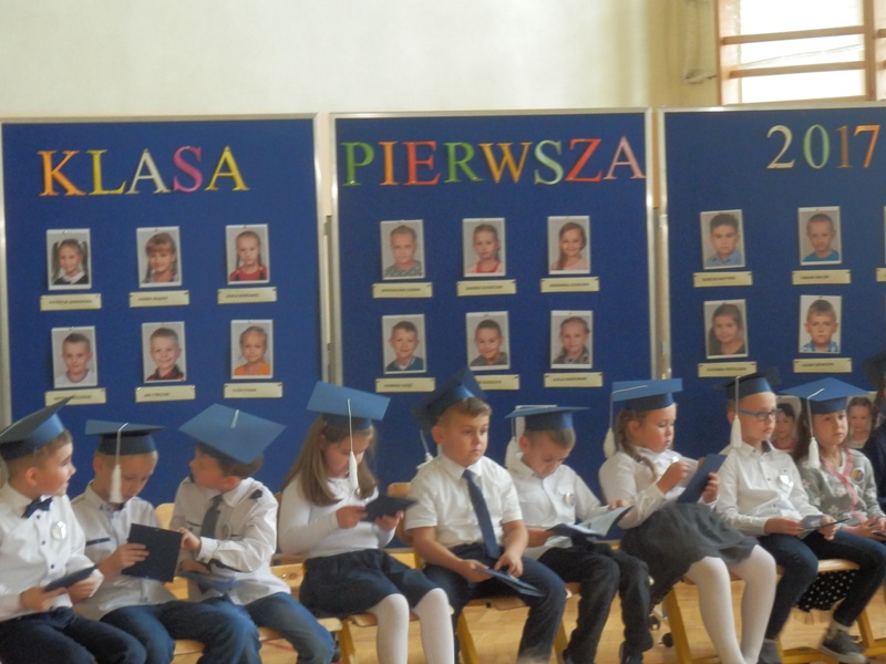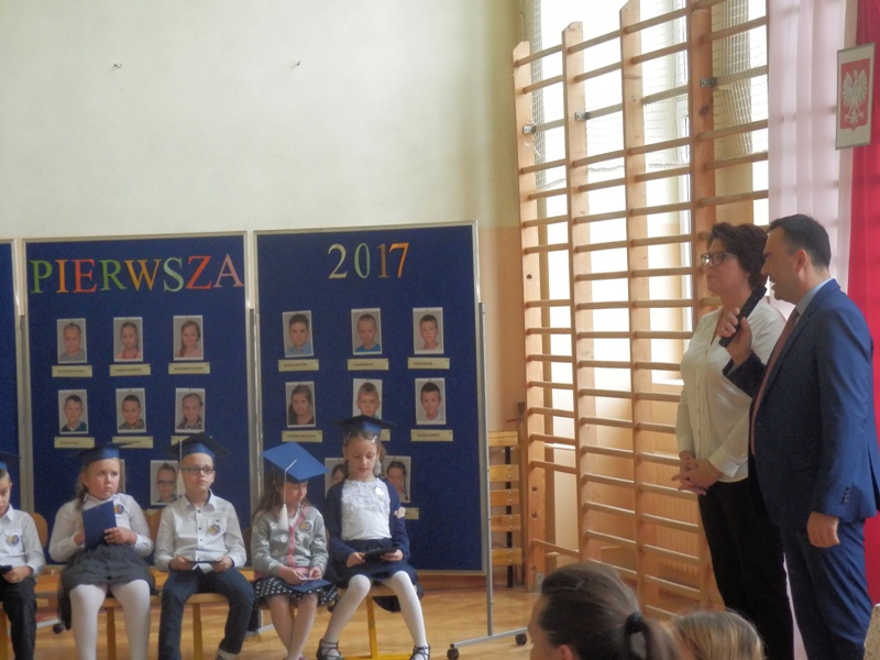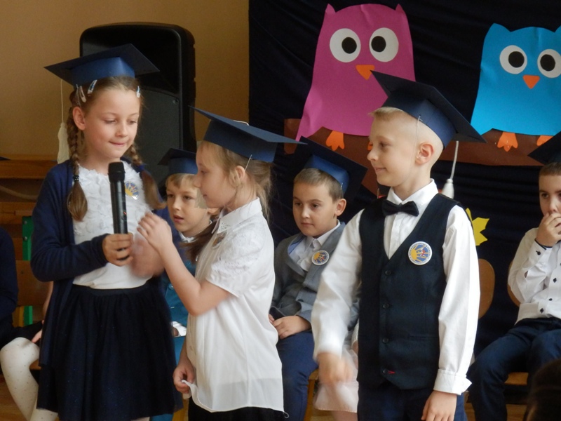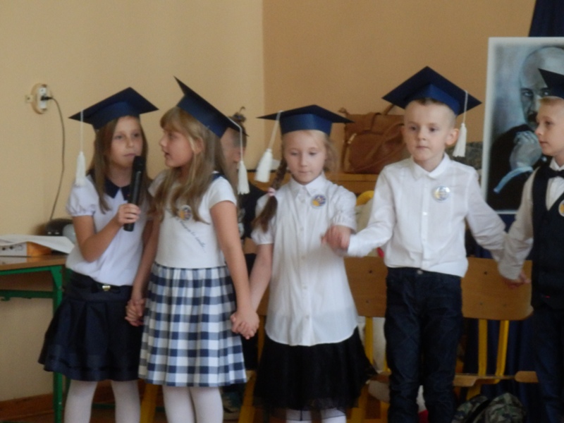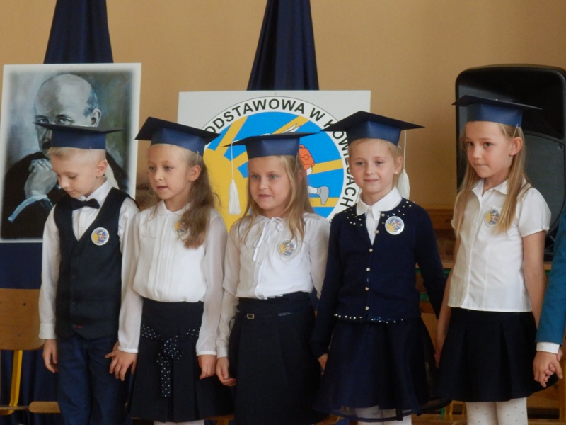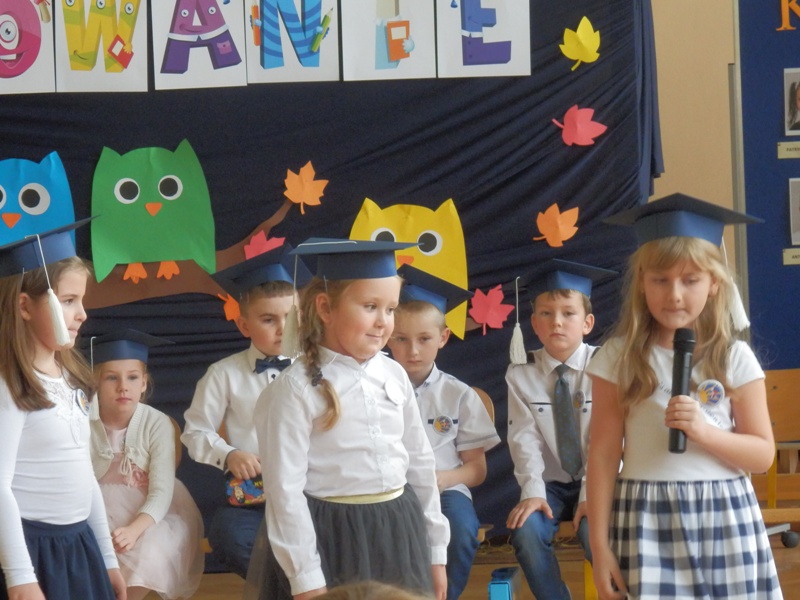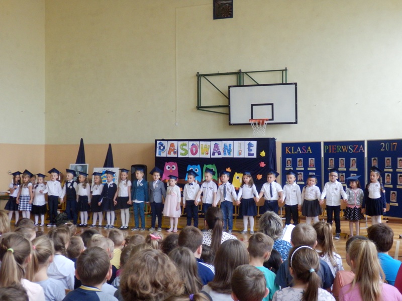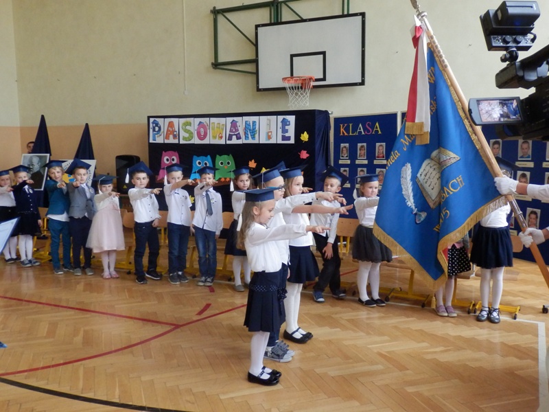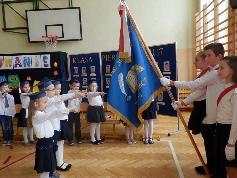 Uczniowie klasy pierwszej pod bacznymi okiem swojej wychowawczyni pani Doroty Wacławek przygotowali program artystyczny, w którym zaprezentowali swoje umiejętności muzyczne i recytatorskie. Następnie wszyscy z wielkim przejęciem ślubowali na Sztandar Szkoły. Po ślubowaniu pani dyrektor Lidia Wiedeńska, każde dziecko pasowała na ucznia oraz w słowach pełnych otuchy przekazała pierwszoklasistom życzenia m. in. wielu sukcesów.