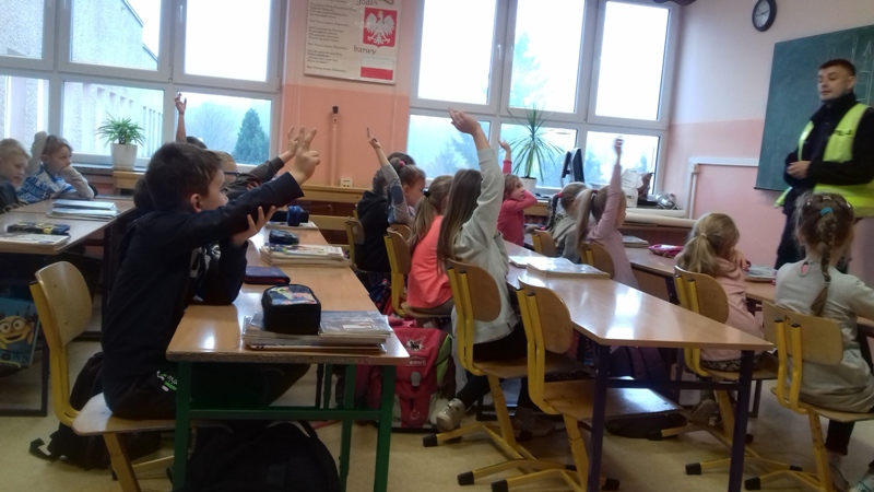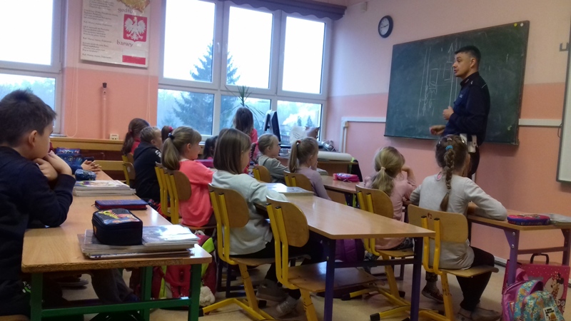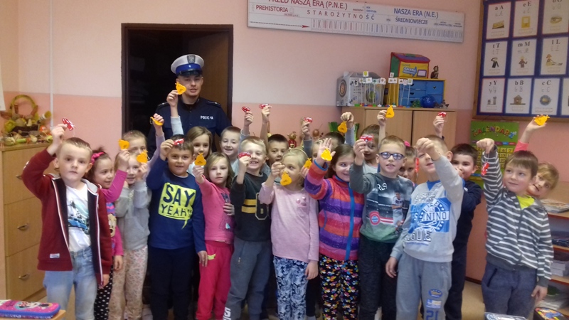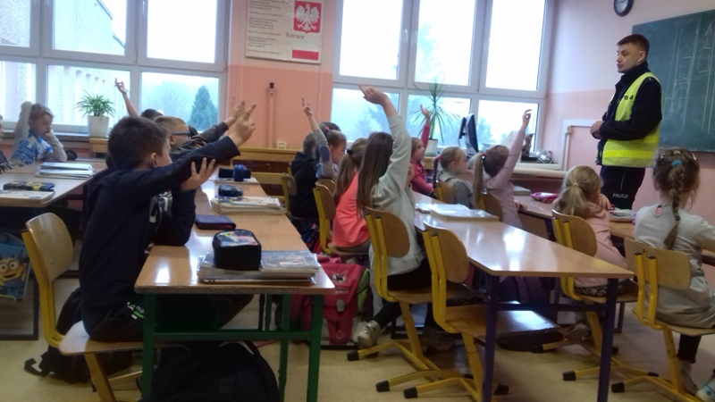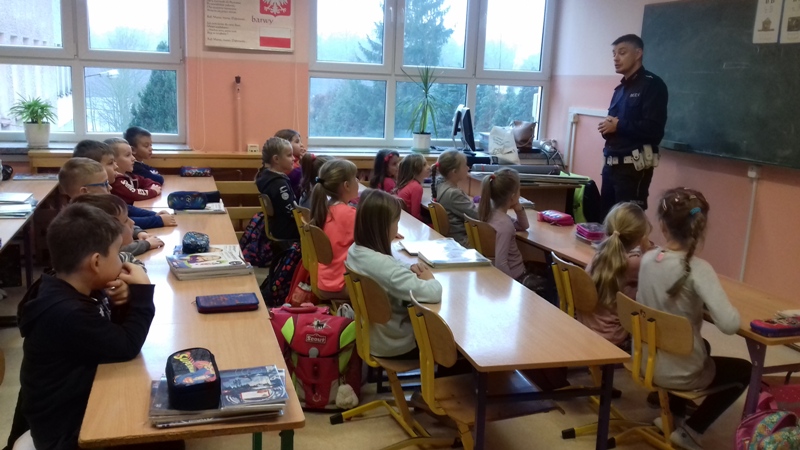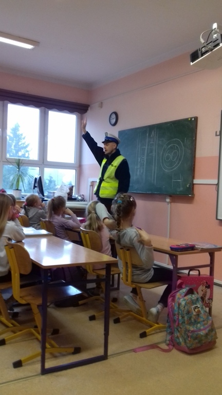 16 listopada w ramach akcji "Odblaskowe pierwszaki" uczniów klasy pierwszej odwiedził młodszy aspirant Marcin Kleczko z Wydziału Ruchu Drogowego Komendy Miejskiej Policji w Skierniewicach. W trakcie spotkania uczniowie zostali zapoznani z podstawowymi zasadami ruchu drogowego, usłyszeli wiele ważnych informacji na temat właściwego zachowania podczas przechodzenia przez jezdnię oraz odpowiedniego oznakowania swojego ubioru. Wspólne spotkanie z dziećmi było również okazją do przybliżenia zawodu policjanta oraz przekazania informacji o tym, jak ważna jest dbałość o własne bezpieczeństwo. Na zakończenie spotkania, aby dzieci były bardziej widoczne na drodze, każde z nich otrzymało odblaskową zawieszkę. Rozmowa z policjantem była dla dzieci wielkim wydarzeniem.