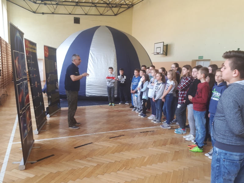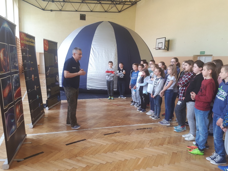 W czwartek 26.04.2018r. naszą szkołę odwiedziło mobilne planetarium. Tego dnia każda klasa miała możliwość uczestniczenia w zajęciach z astronomii: „Kolorowy wszechświat”. Uczniowie byli zaproszeni na seans do ogromnego namiotu – planetarium, gdzie odbyli podróż po wszechświecie. Obserwowali i "zwiedzili" planety naszego układu słonecznego. Pokazy dostarczyły niezapomnianych wrażeń i rozbudziły wyobraźnię uczniów.