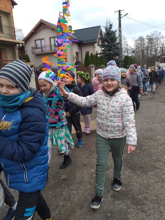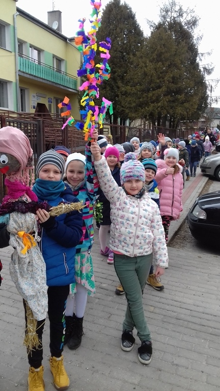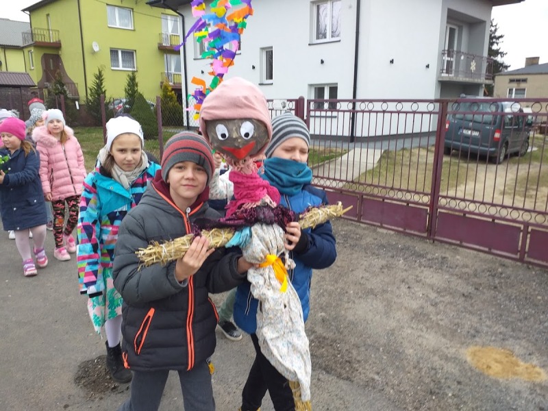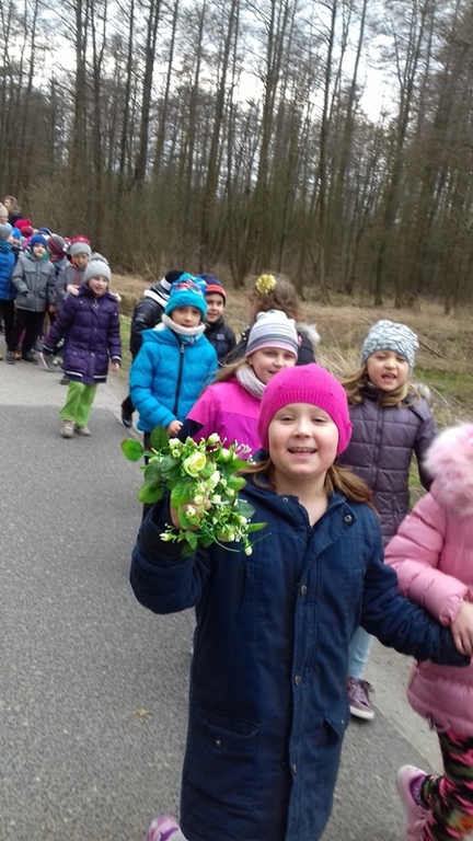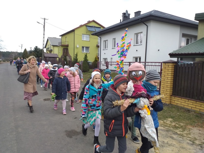 We wtorek 21 marca wszystkie dzieci z klas 0- 3 świętowały Pierwszy Dzień Wiosny. Aby podkreślić charakter tego dnia, uczniowie przyszli ubrani na zielono. Uroczystość powitania Wiosny rozpoczęto od odczytania listu od Pani Wiosny. Mimo wielu atrakcji najbardziej oczekiwaną częścią dnia było wyjście na spacer, podczas którego uczniowie mogli pożegnać zimę i powitać wiosnę. Dzieci radośnie maszerowały w wiosennym pochodzie, niosąc Marzannę, którą pożegnano zgodnie z tradycją. Wracając podziwiano pierwsze oznaki wiosny.