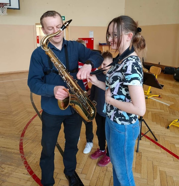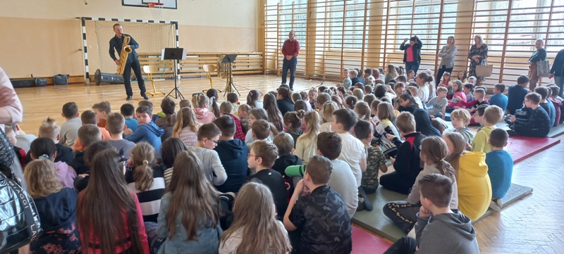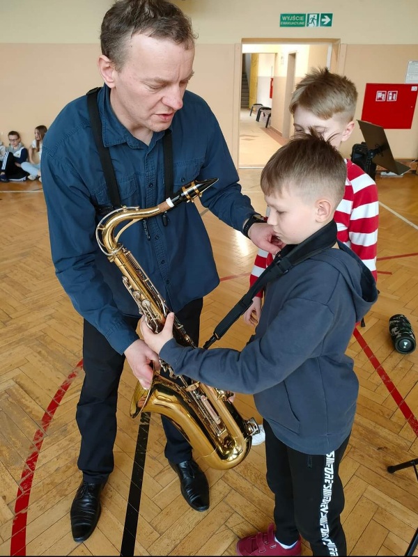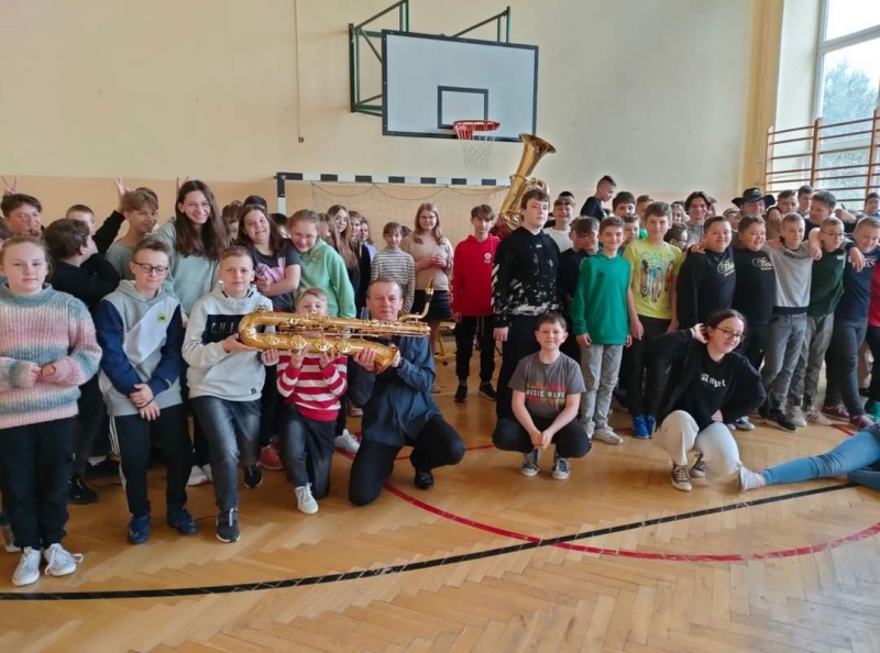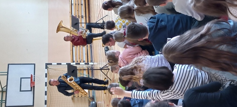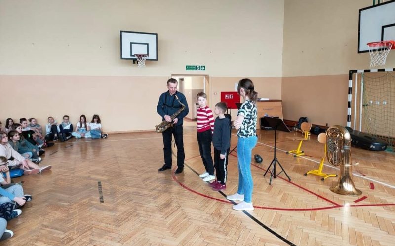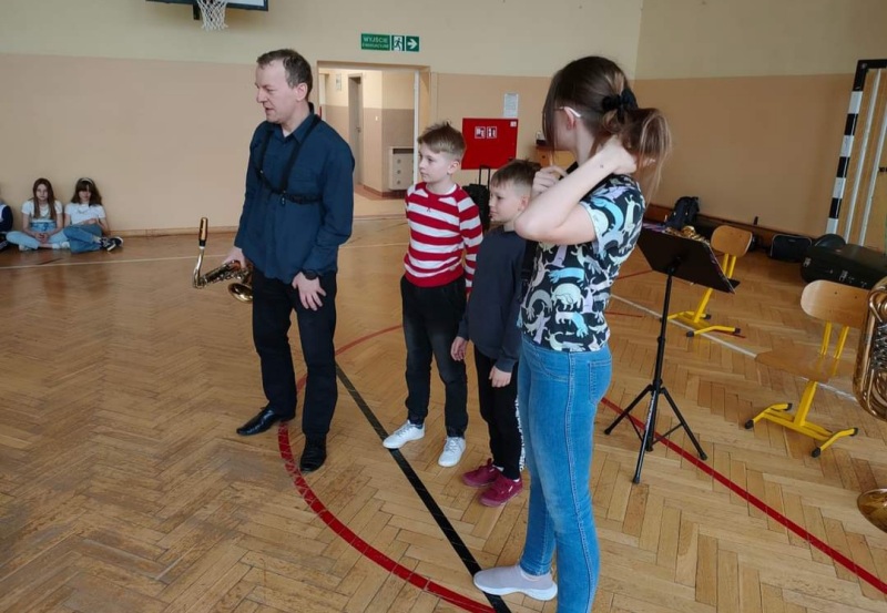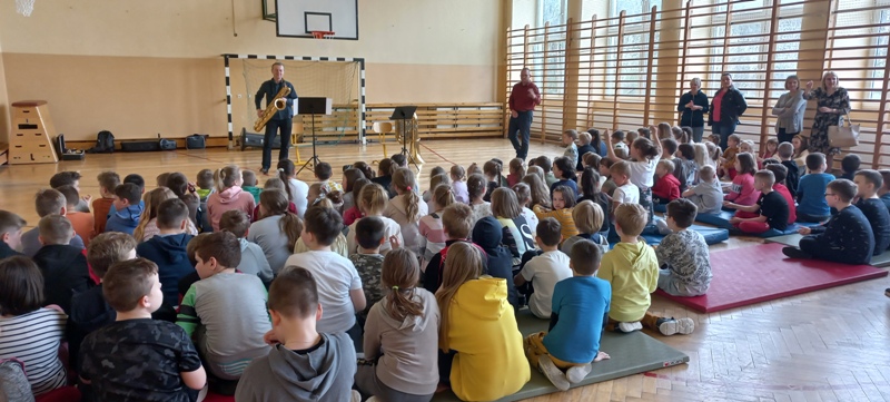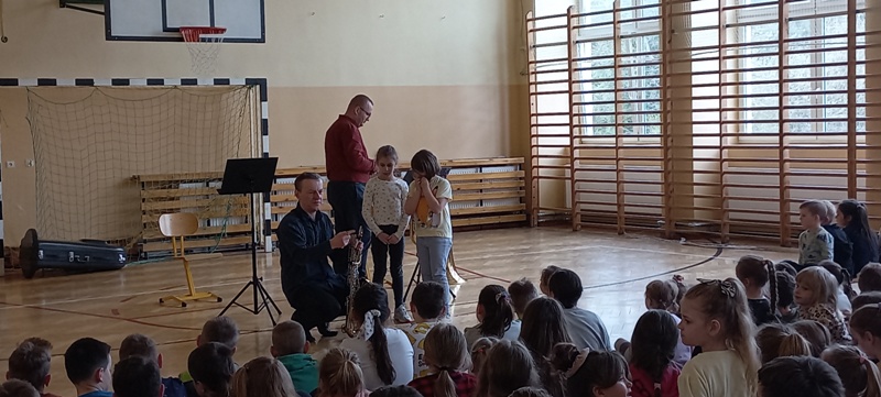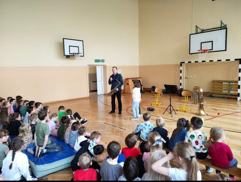 Dnia 27 kwietnia 2022 roku w naszej szkole odbyły się audycje muzyczne prowadzone przez muzyków z Repezentacyjnego Zespołu Artystycznego Wojska Polskiego. Uczniowie poznali budowę i brzmienie saksofonu barytonowego oraz próbowali na nim grac. Dzieci słuchały, spiewaly i klaskały. Wszystkim bardzo podobała się ta podróż do krainy muzyki.