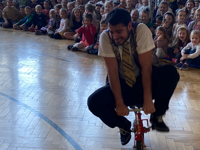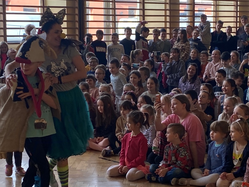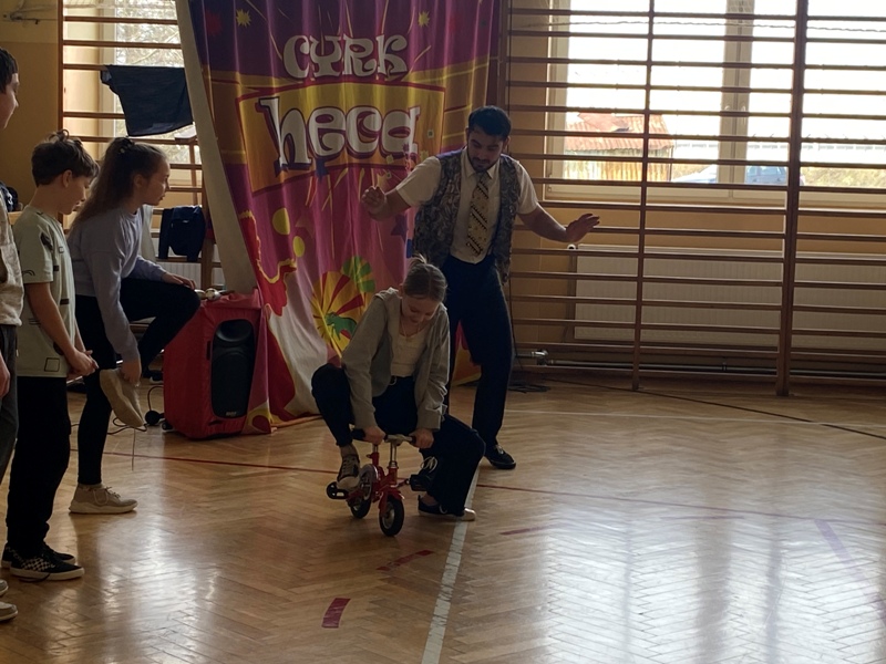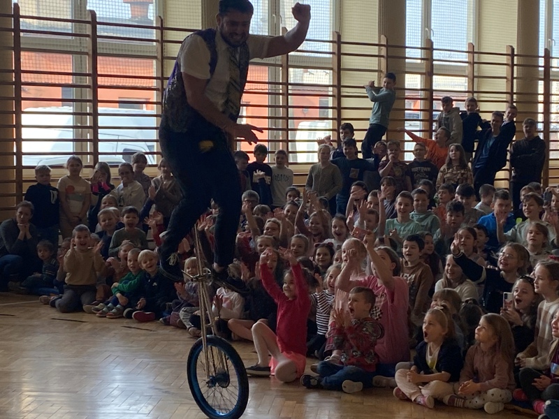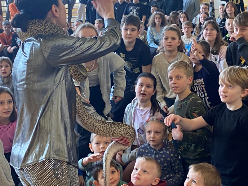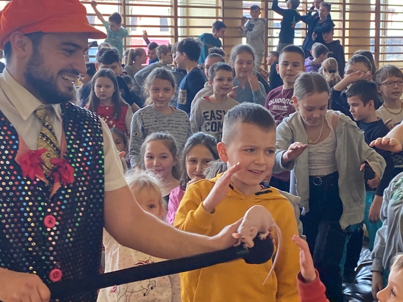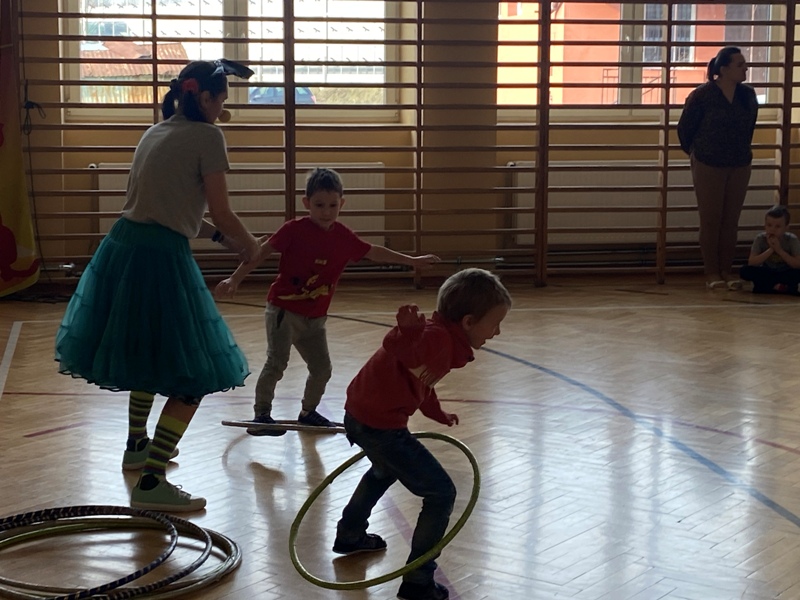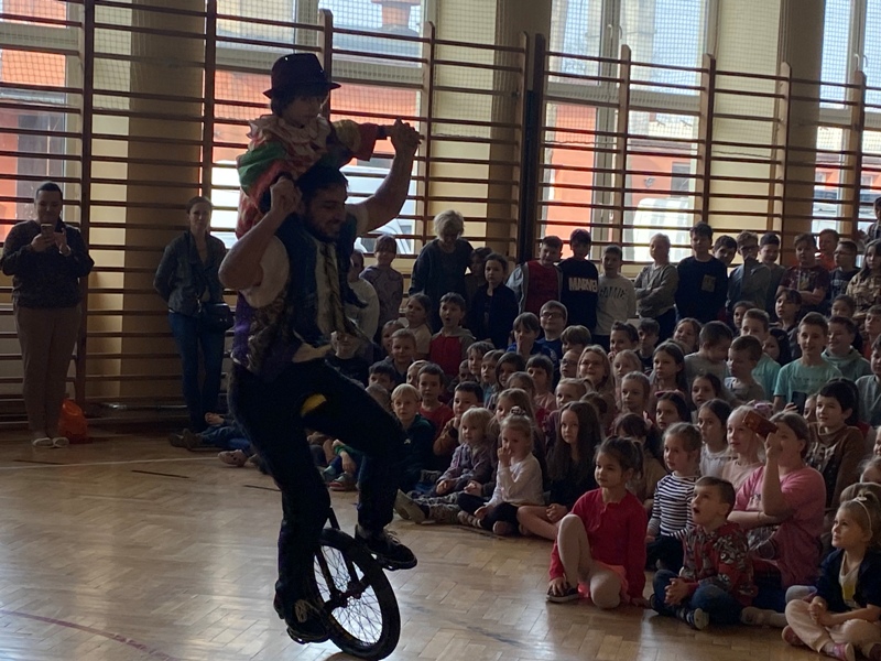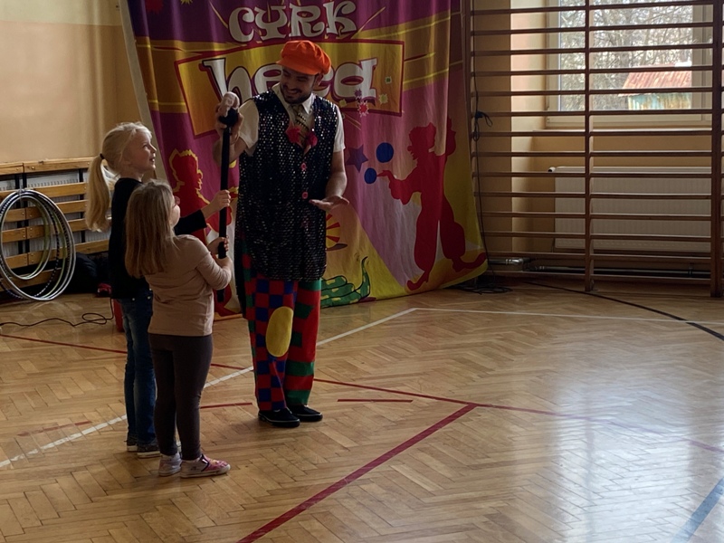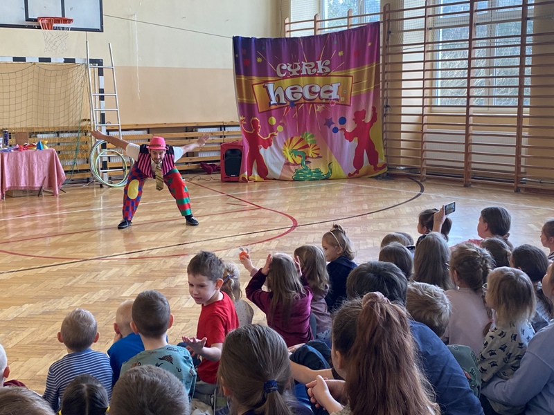 24 lutego odwiedził naszą szkołę CYRK HECA. Cyrkowcy prezentowali żonglerkę, iluzję i różnego rodzaju akrobacje. Wielką atrakcją były zwierzęta – biały szczur i wąż, które nie tylko brały udział w pokazie, ale każde dziecko mogło je dotknąć lub pogłaskać. Występ został tak przygotowany aby publiczność mogła brać w nim udział. Dzieci bardzo chętnie i z wielkim zaangażowaniem zgłaszały się i wykonywały proponowane czynności. Było dużo śmiechu.