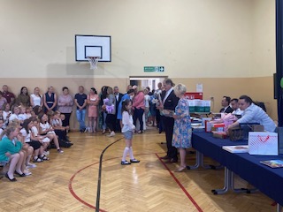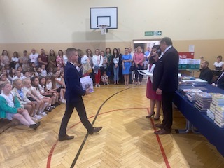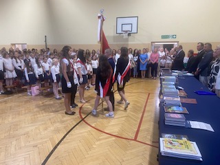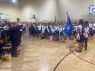 Uroczystość rozpoczęła się wprowadzeniem sztandaru szkoły i odśpiewaniem hymnu narodowego, a następnie przekazaniem sztandaru uczniom klasy VII. Pan Dyrektor Marek Adamczyk wręczył świadectwa i nagrody ósmoklasistom oraz uczniom kl I-VII.