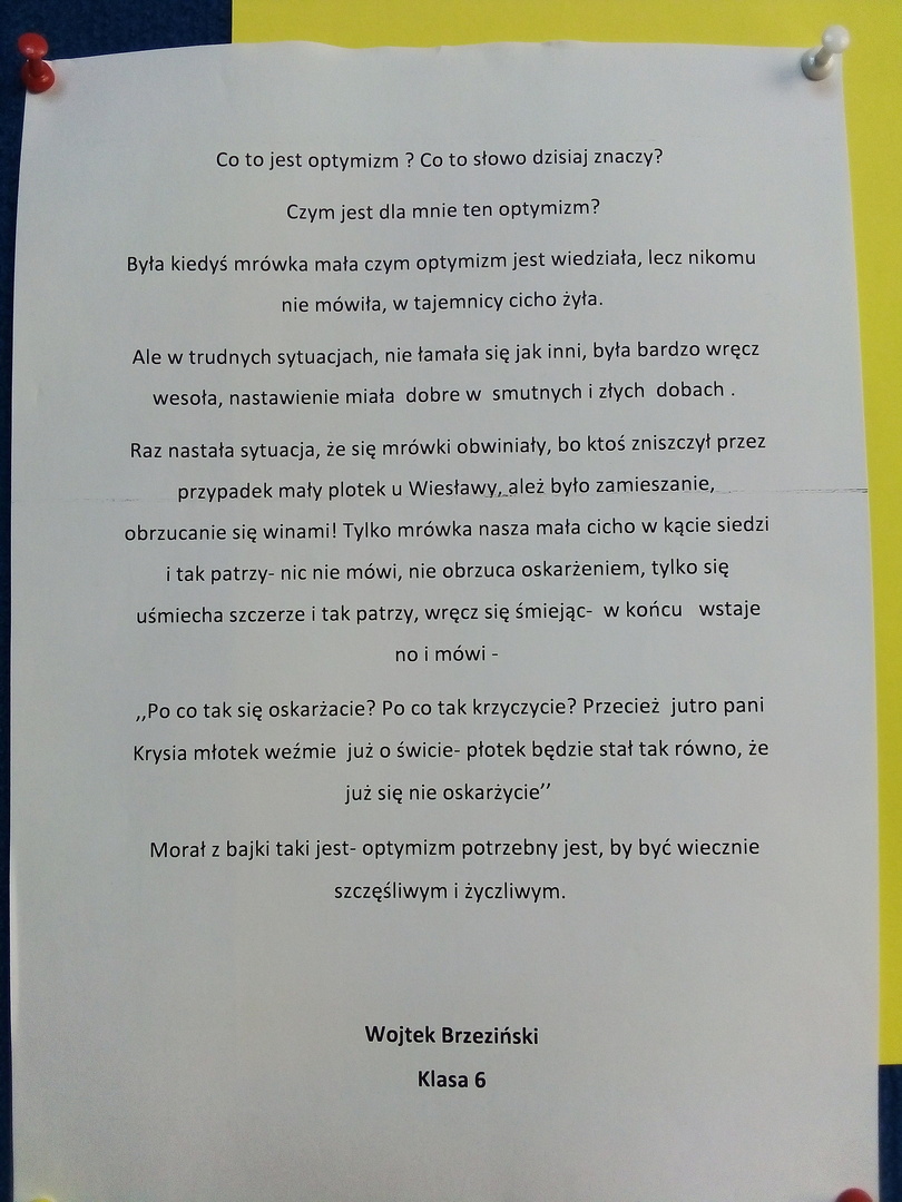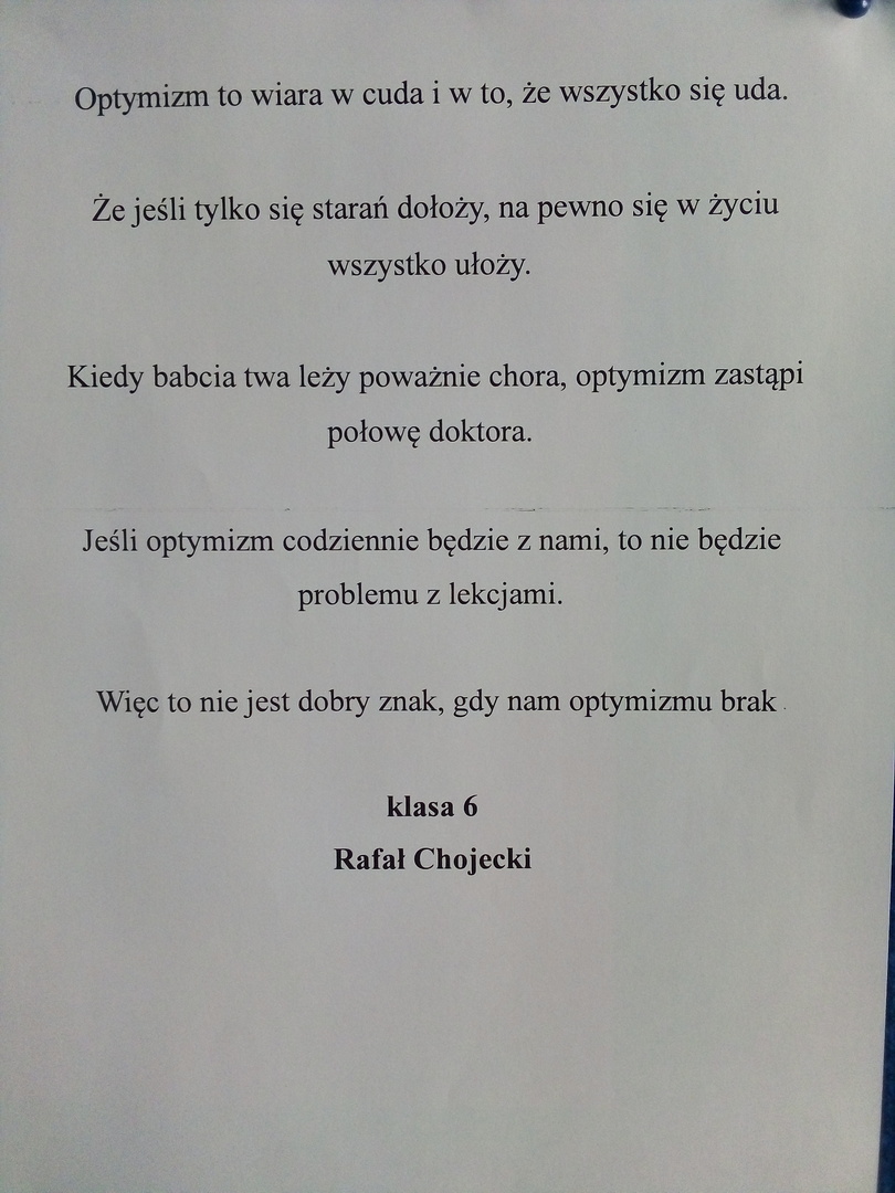 Niezwykłym zwieńczeniem obchodów IV Ogólnopolskiego Tygodnia Szczęścia w Szkole było wykonanie przez szóstoklasistów wyzwania przewidzianego na ten rok, a mianowicie napisanie utworu literackiego. Wielkie brawa i uznanie należą się Wojciechowi Brzezińskiemu i Rafałowi Chojeckiemu #tydzienszczesciawszkole2023 #happinessatschool, którzy podjęli się tego zadania i napisali piękne utwory, które również znajdują się w naszej galerii. Nie zapomnijcie ich przeczytać! Tydzień szczęścia w szkole to zdecydowanie za mało, dlatego też będziemy kontynuować zagadnienia szczęścia i optymizmu na zajęciach wychowawczych.