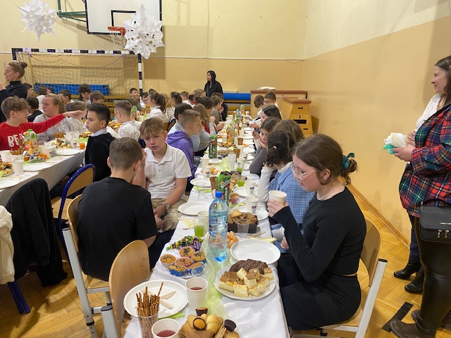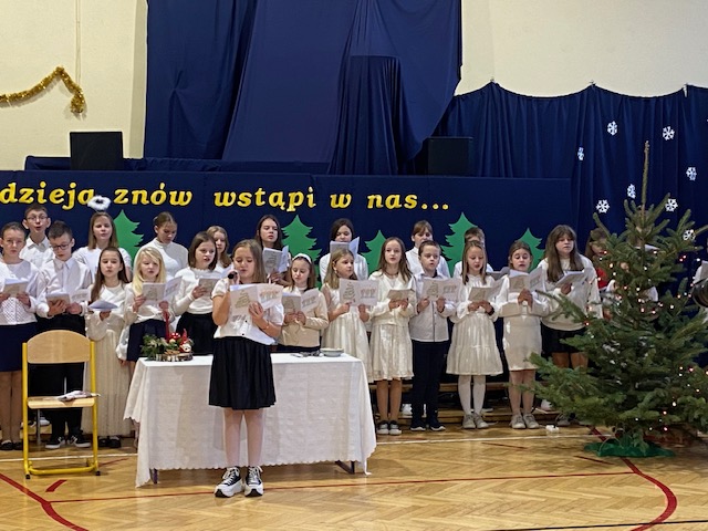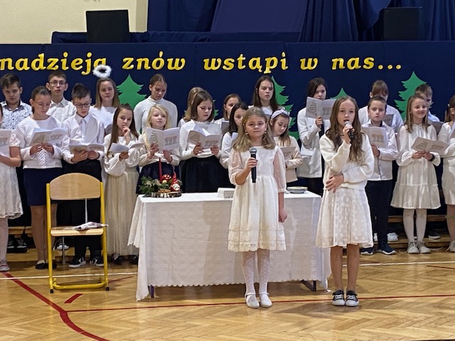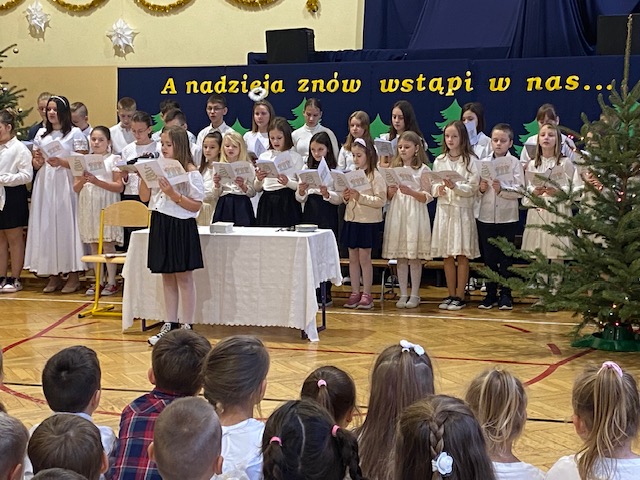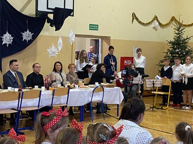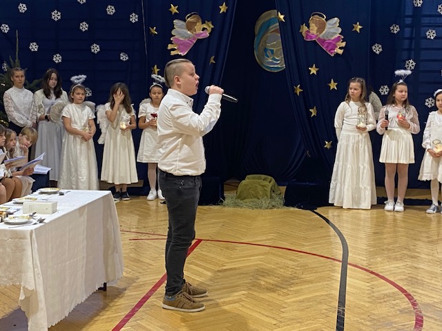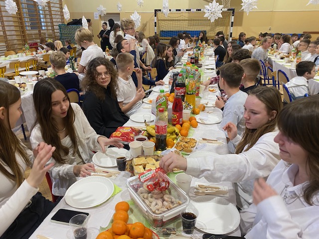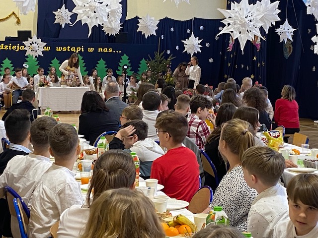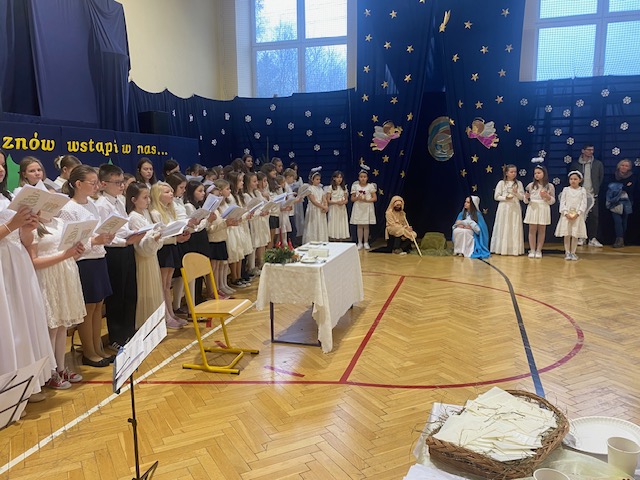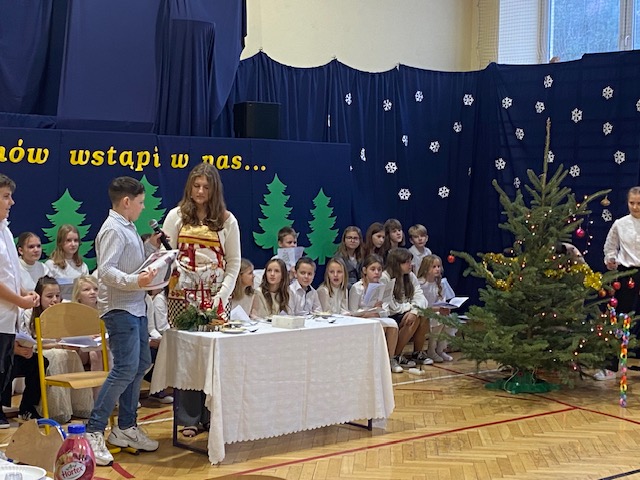 20 grudnia w naszej szkole odbyła się WIGILIA SZKOLNA. Pani dyrektor Agnieszka Staszewska powitała całą społeczność szkolną, która zebrała się w sali gimnastycznej, aby obejrzeć JASEŁKA w wykonaniu uczniów klasy III i VIIa pod kierunkiem katechetki pani Jolanty Niewczas. Po raz kolejny mogliśmy przeżyć historię Marii i Józefa, odkryć na nowo wydarzenia, które miały miejsce ponad dwa tysiące lat temu. Artyści wprowadzili nas w świąteczny nastrój, salę zaś zdobiła piękna dekoracja przygotowana pod kierunkiem pani Agnieszki Szkopińskiej - Wójcik. Chór szkolny prowadzony przez panią Dominikę Sobczyńską cudownie zaśpiewał pastorałki i kolędy. Nie zabrakło również życzeń świątecznych od przybyłych gości: Wójta Gminy Kowiesy Jarosława Pepki i ks. proboszcza Krzysztofa Majchera. Po skończonej części artystycznej wszyscy zasiedliśmy do wigilijnego stołu.