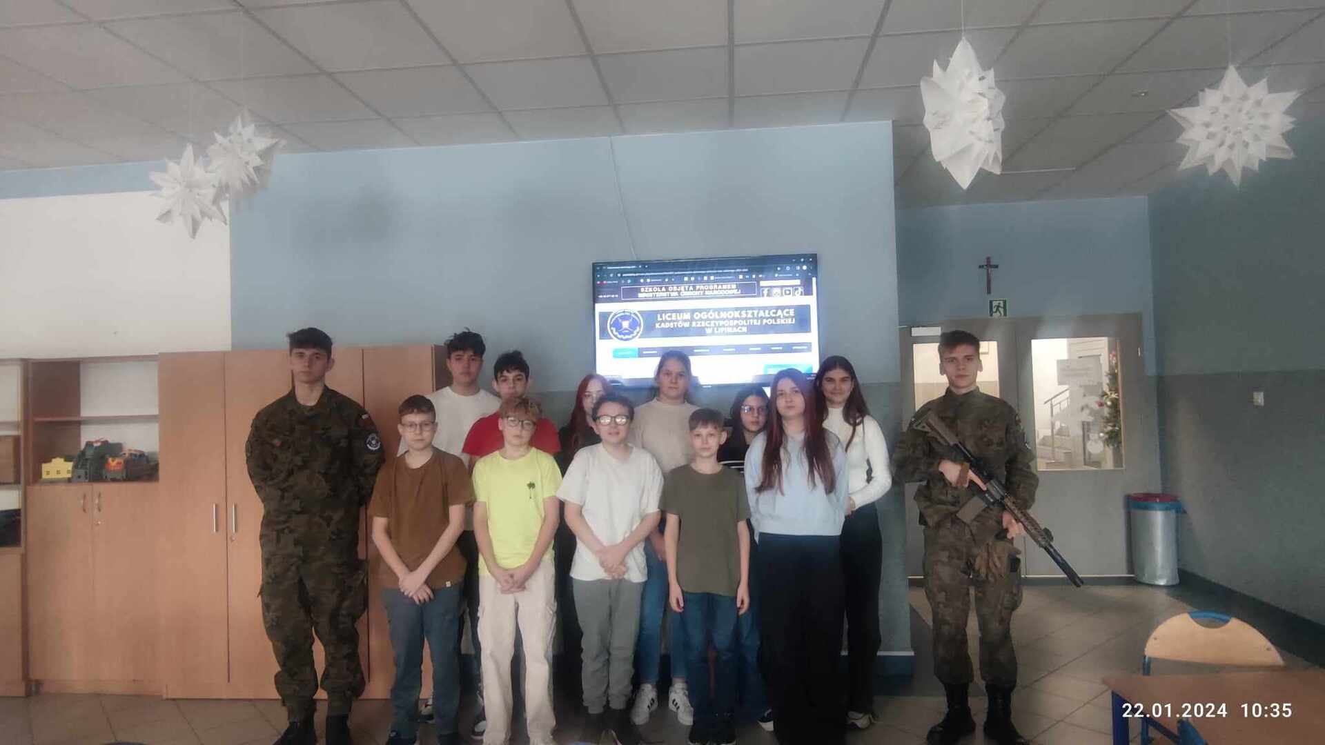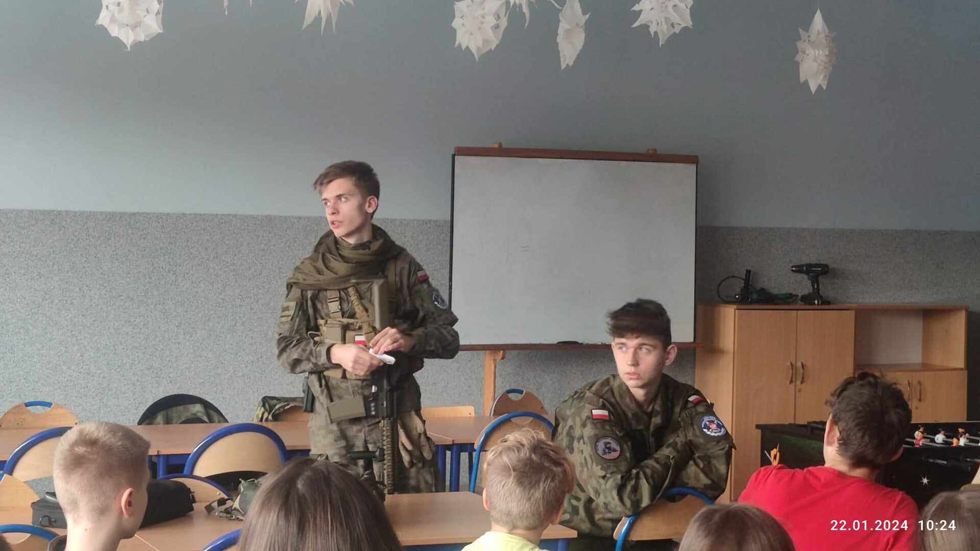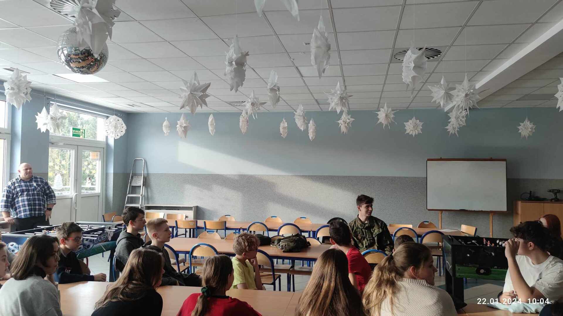 22 stycznia w murach naszej szkoły gościliśmy naszych absolwentów: Fabiana Betę oraz Maksymiliana Śliwińskiego. Chłopcy uczęszczają to Zespołu Szkół im. dr Heleny Spoczyńskiej w Lipinach. Jest to jedyna skoszarowana szkoła w Polsce. Podczas tej wizyty chłopcy opowiedzieli swoim młodszym kolegom i koleżankom, jak wygląda nauka i życie w tej szkole. Młodzież z zaciekawieniem oglądała filmy i zdjęcia prezentujące ich placówkę, oraz chętnie rozmawiała z chłopcami na temat ich szkoły.