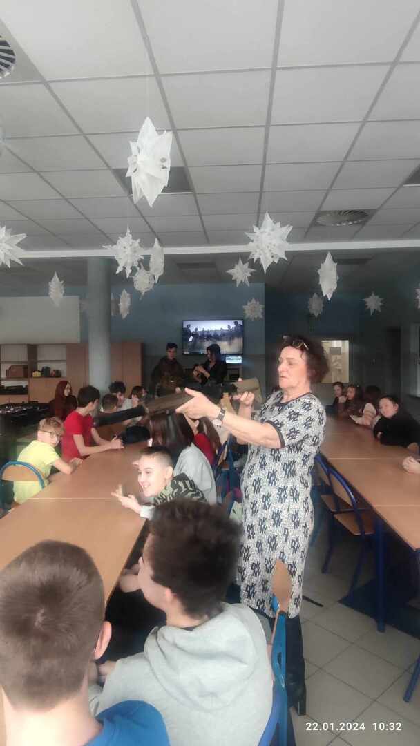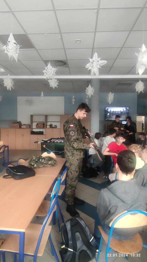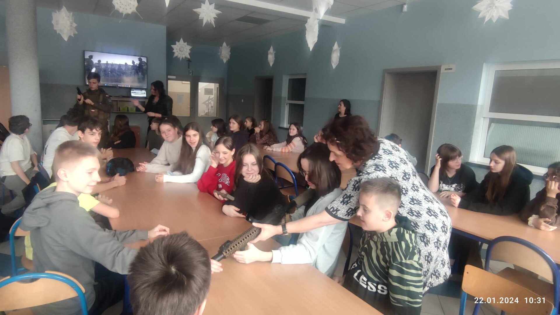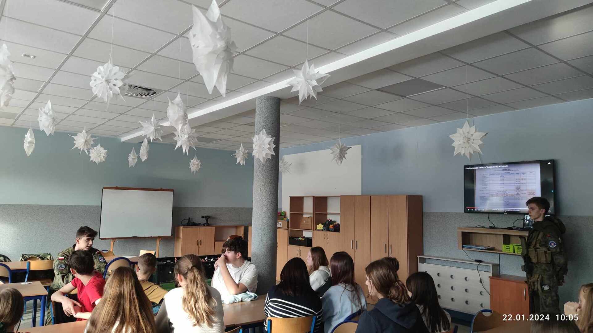 22 stycznia w murach naszej szkoły gościliśmy naszych absolwentów: Fabiana Betę oraz Maksymiliana Śliwińskiego. Chłopcy uczęszczają to Zespołu Szkół im. dr Heleny Spoczyńskiej w Lipinach. Jest to jedyna skoszarowana szkoła w Polsce. Podczas tej wizyty chłopcy opowiedzieli swoim młodszym kolegom i koleżankom, jak wygląda nauka i życie w tej szkole. Młodzież z zaciekawieniem oglądała filmy i zdjęcia prezentujące ich placówkę, oraz chętnie rozmawiała z chłopcami na temat ich szkoły.