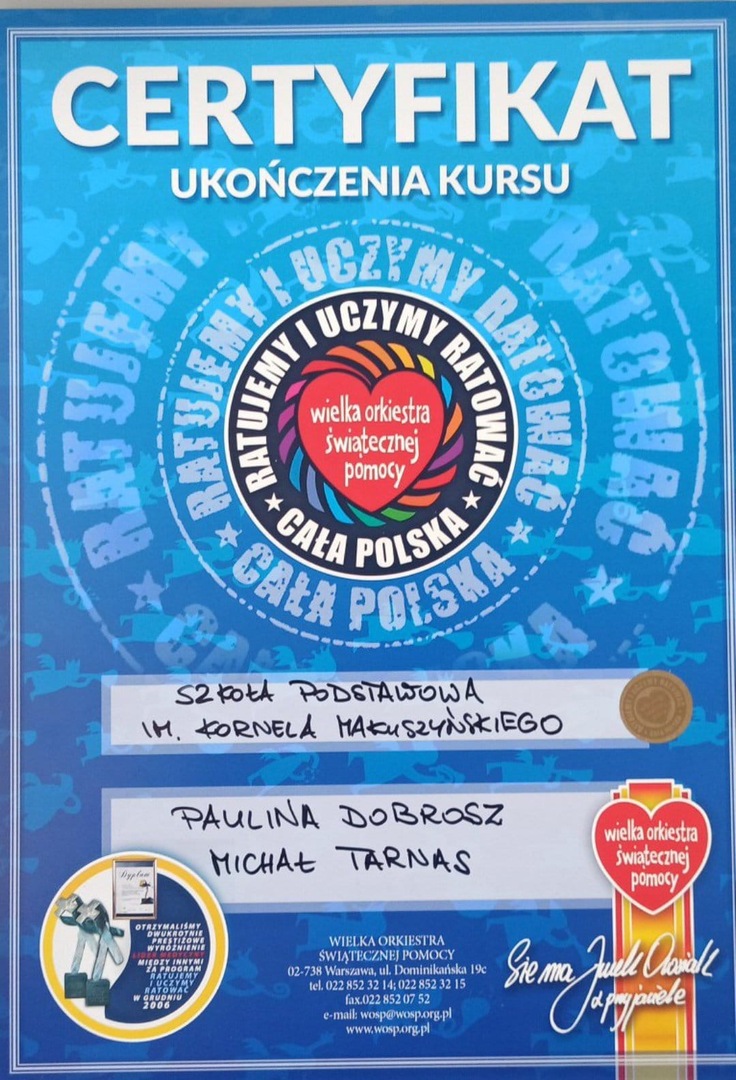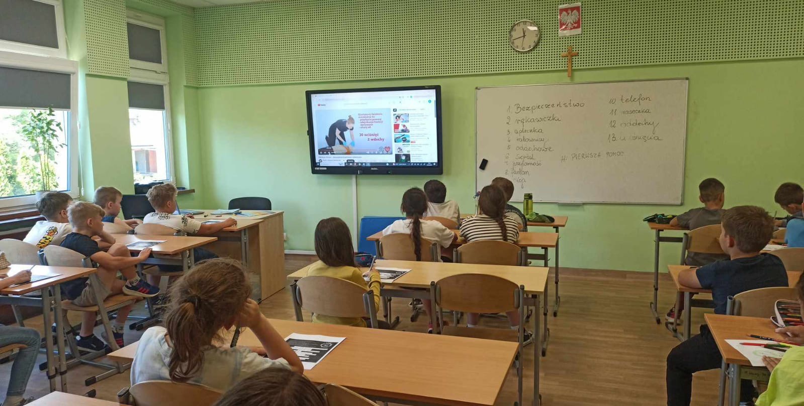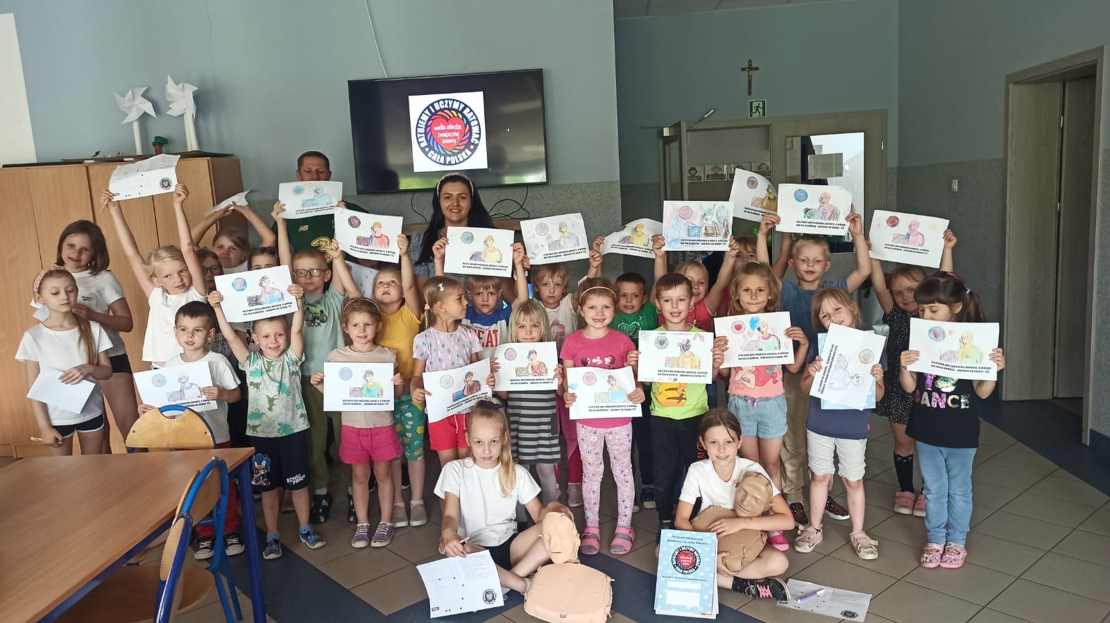 Nasza placówka przystąpiła do Programu Edukacyjnego „Ratujemy i uczymy ratować”, którego głównym celem jest przekazywanie przedszkolakom oraz uczniom klas I-III szkoły podstawowej wiedzy z zakresu udzielania pierwszej pomocy. Otrzymując od Fundacji Wielka Orkiestra Świątecznej Pomocy materiały edukacyjne – fantomy do nauki resuscytacji, podręczniki, ćwiczenia orazdoda tkowe materiały dydaktyczne w naszej szkole zostały przeprowadzone zajęcia przez p. Paulinę Dobrosz oraz p. Michała Tarnas. Podczas zajęć dzieci i uczniowie pozyskali wiedzę na temat obowiązku i zakresu pierwszej pomocy, poznali środki ochrony osobistej dla ratownika, utrwalili numery alarmowe, odgrywali scenki sytuacyjne podczas których przekazywali w rozmowie z ratownikiem najważniejsze informacje, układali poszkodowanego w pozycji bezpiecznej, ćwiczyli na fantomach resuscytację krążeniowo – oddechową, wykonywali również krzyżówki i malowali kolorowanki z zakresu pierwszej pomocy.