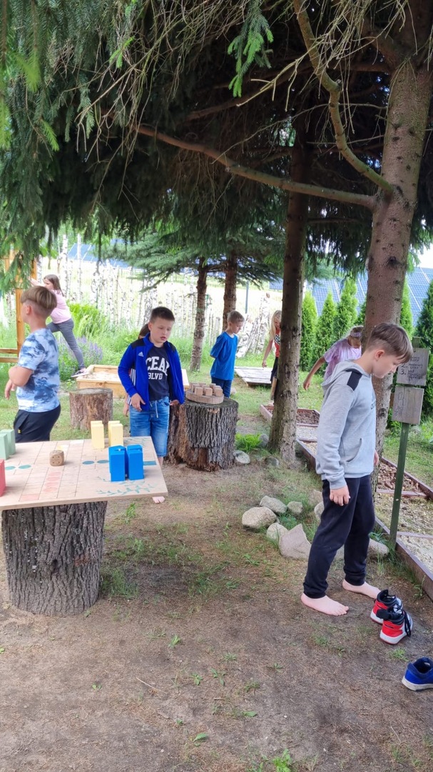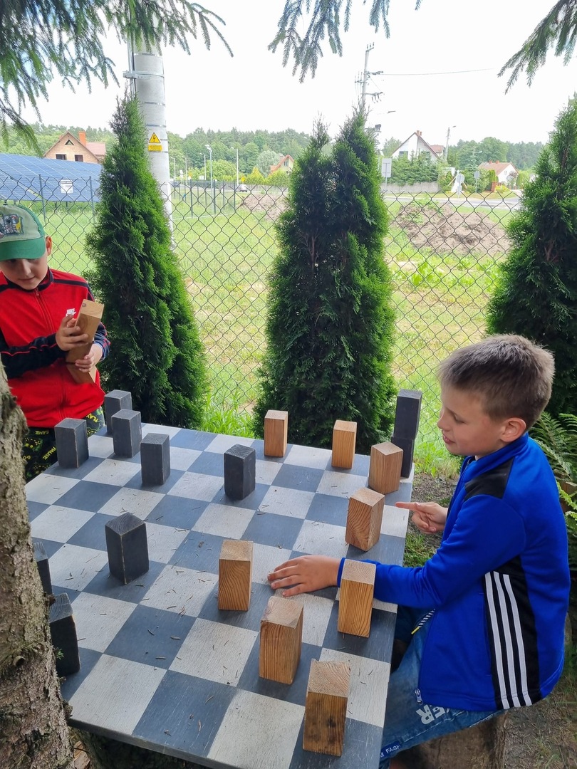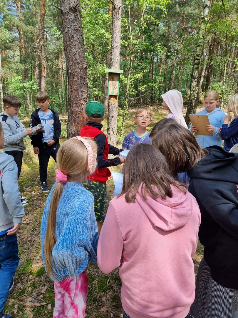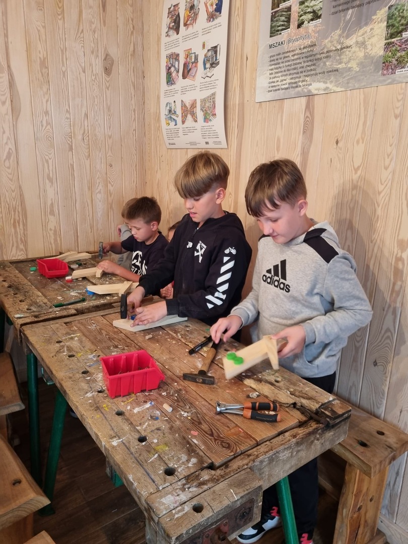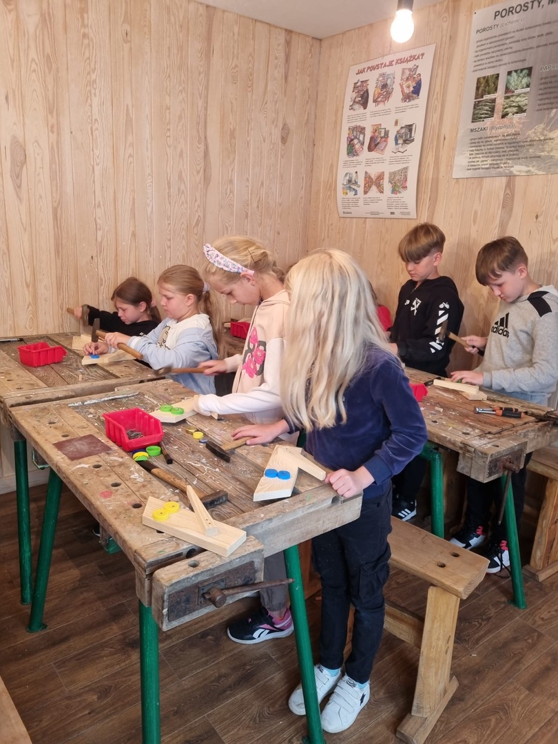5 czerwca 2024 r. klasa druga odwiedziła Wioskę Mchu i Paproci w Wólce Lesiewskiej. Główną atrakcją były warsztaty w stolarni, gdzie uczniowie wykonywali drewniane sówki. Z wielkim zaangażowaniem szlifowali drewniane elementy papierem ściernym, przybijali gwoździe, kleili i ozdabiali swoje prace. Następnie uczestniczyli w grze terenowej,poruszając się szlakiem niebieskim w pobliskim lesie. Na koniec wszyscy posilili się pieczonymi kiełbaskami oraz bawili się zabawkami wykonanymi z drewna. Uczniowie wrócili zmęczeni, ale w wyśmienitych nastrojach.