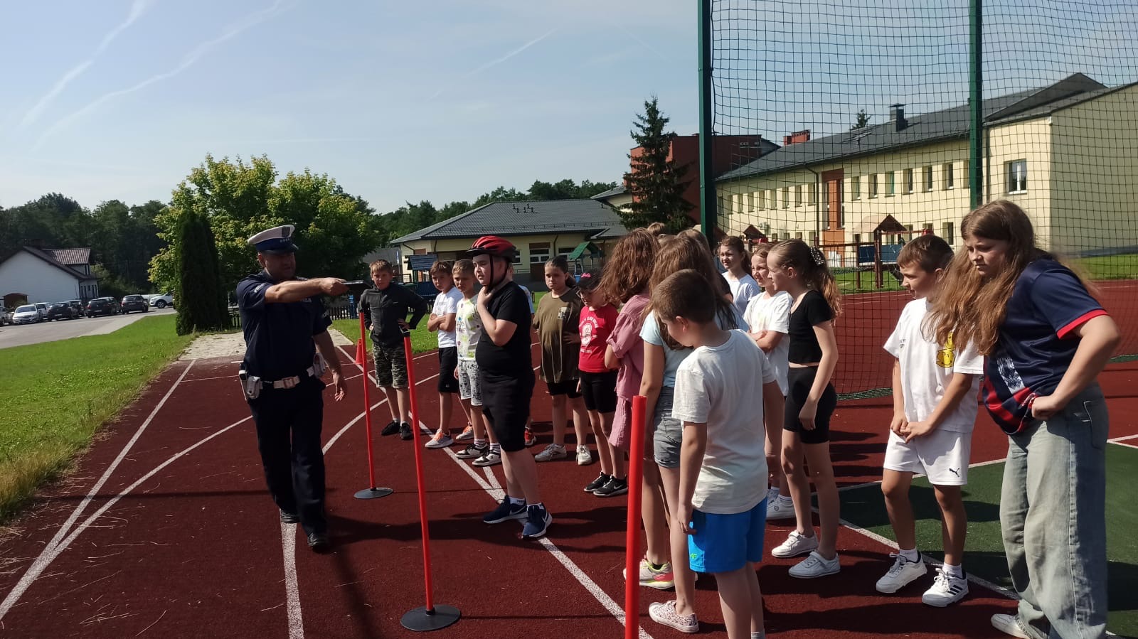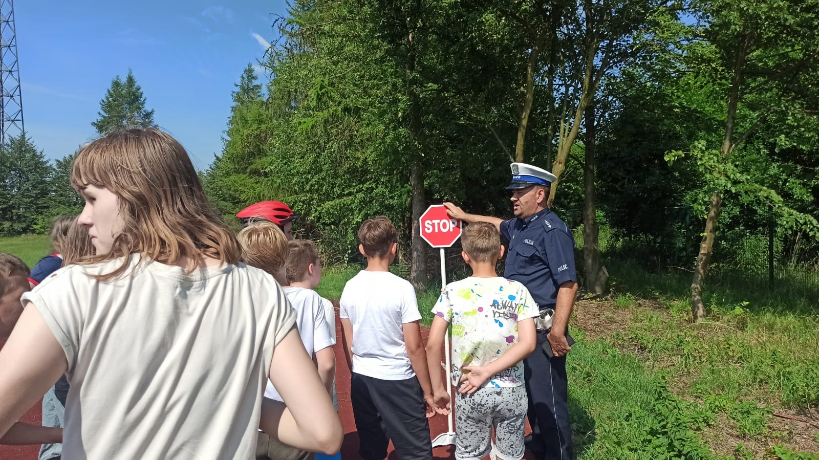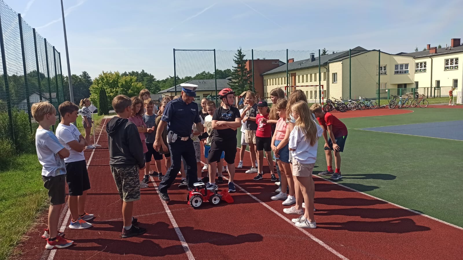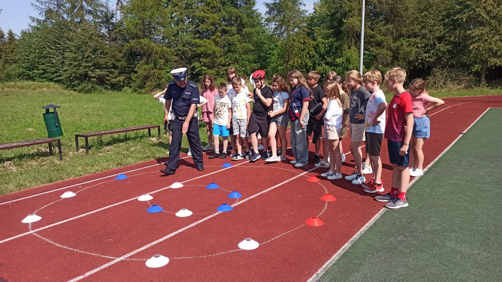 19 czerwca odbył się na terenie boiska w obecności Policjanta egzamin praktyczny na kartę rowerową dla uczniów klasy IV. Egzamin obejmował m.in. przygotowanie roweru do jazdy, jazdę rowerem z manewrem omijania, reagowanie na znaki drogowe, wykonanie slalomu oraz poprawność przejazdu przez przejście dla pieszych.