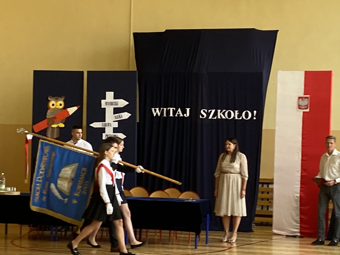 Po odśpiewaniu hymnu państwowego wszystkich zebranych powitała pani dyrektor Agnieszka Staszewska, która w sposób szczególny zwróciła się do najmłodszych uczniów, rozpoczynających naukę w murach naszej szkoły oraz tych najstarszych, przed którymi w tym roku nowe wyzwania, m.in. egzamin ósmoklasisty. Przedstawiła nowych członków grona pedagogicznego oraz wychowawców poszczególnych klas. Życzyła wszystkim uczniom dobrych wyników w nauce oraz dużo radości z czasu spędzonego w szkole, wśród przyjaciół.