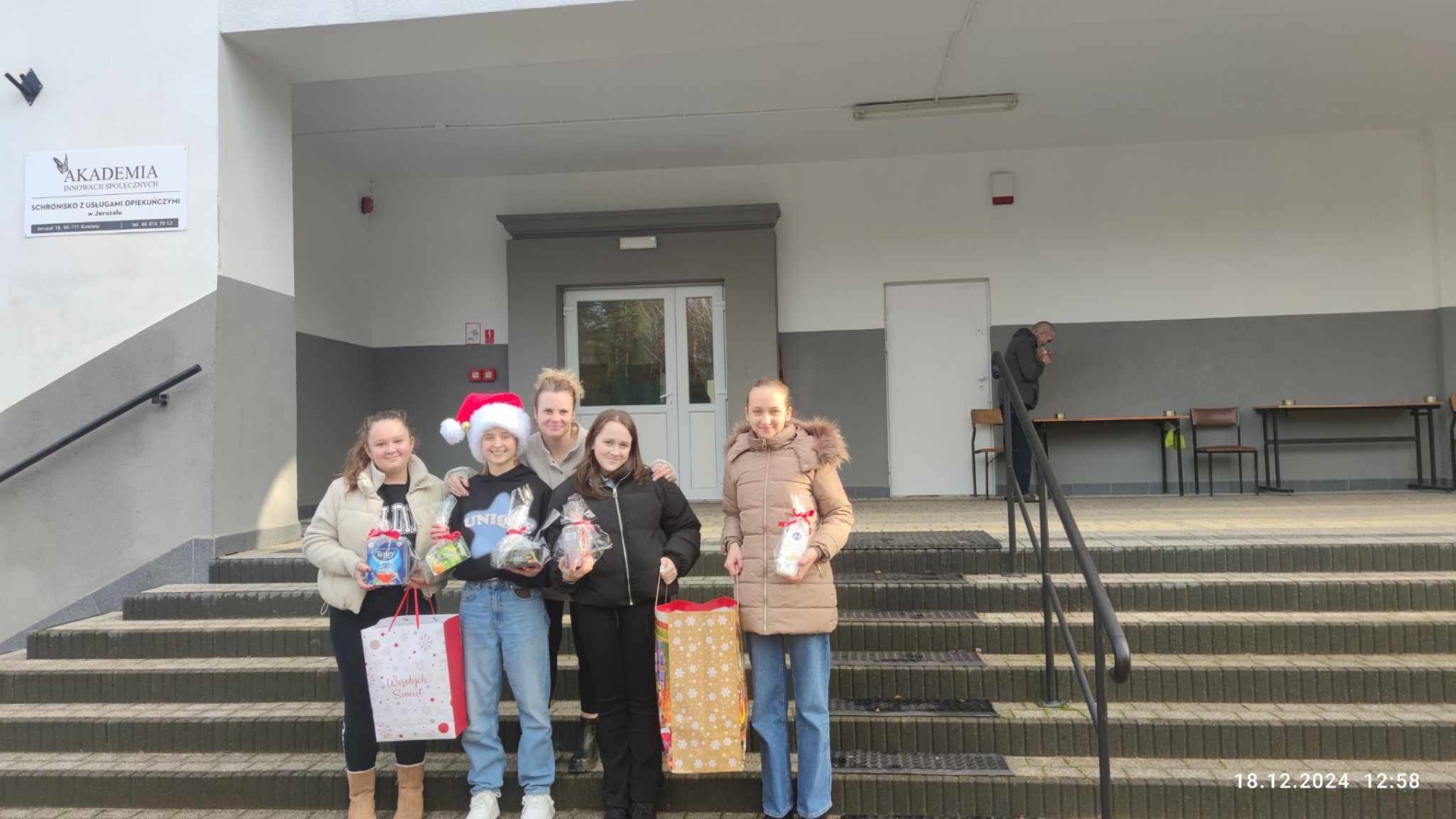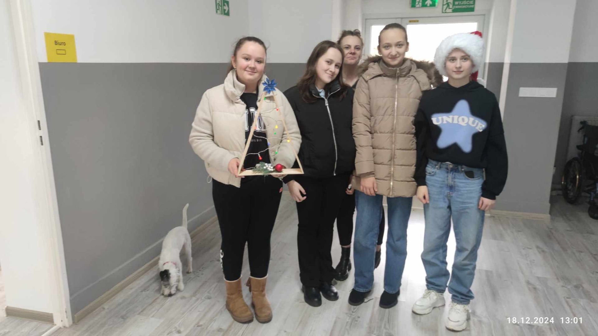 17 grudnia 2024 grupa Wolontariuszek z klasy VIII a wraz z opiekunką p. Agatą Popławską odwiedziła schronisko z usługami opiekuńczymi w Jeruzalu. Z okazji zbliżających się Świąt Bożego Narodzenia młodzi Wolontariusze przygotowali drobne upominki dla podopiecznych tej placówki, które przekazaliśmy na ręce p. Marty Radziwon. My również zostaliśmy obdarowani – dostaliśmy choinkę wykonaną przez mieszkańców placówki.