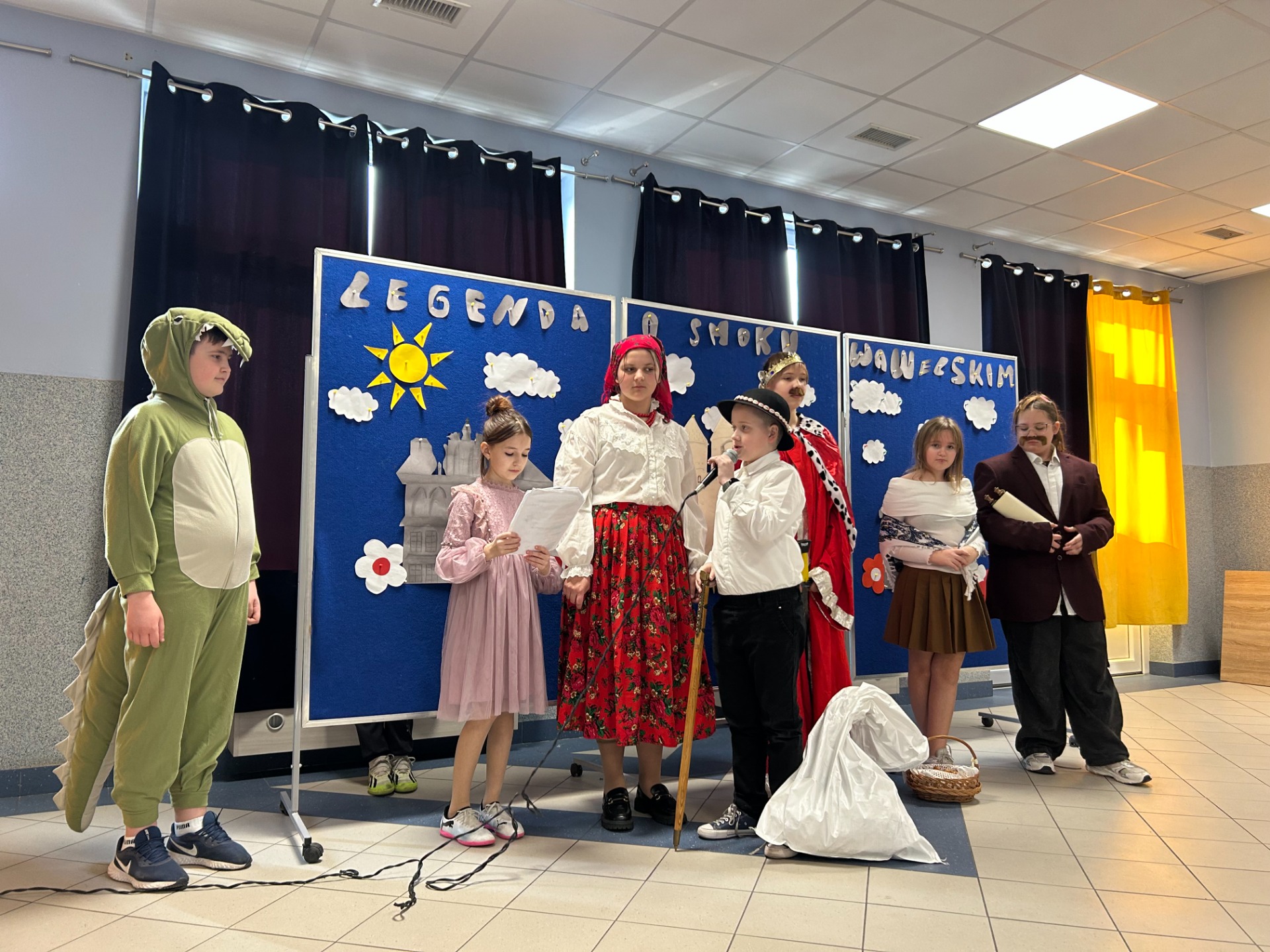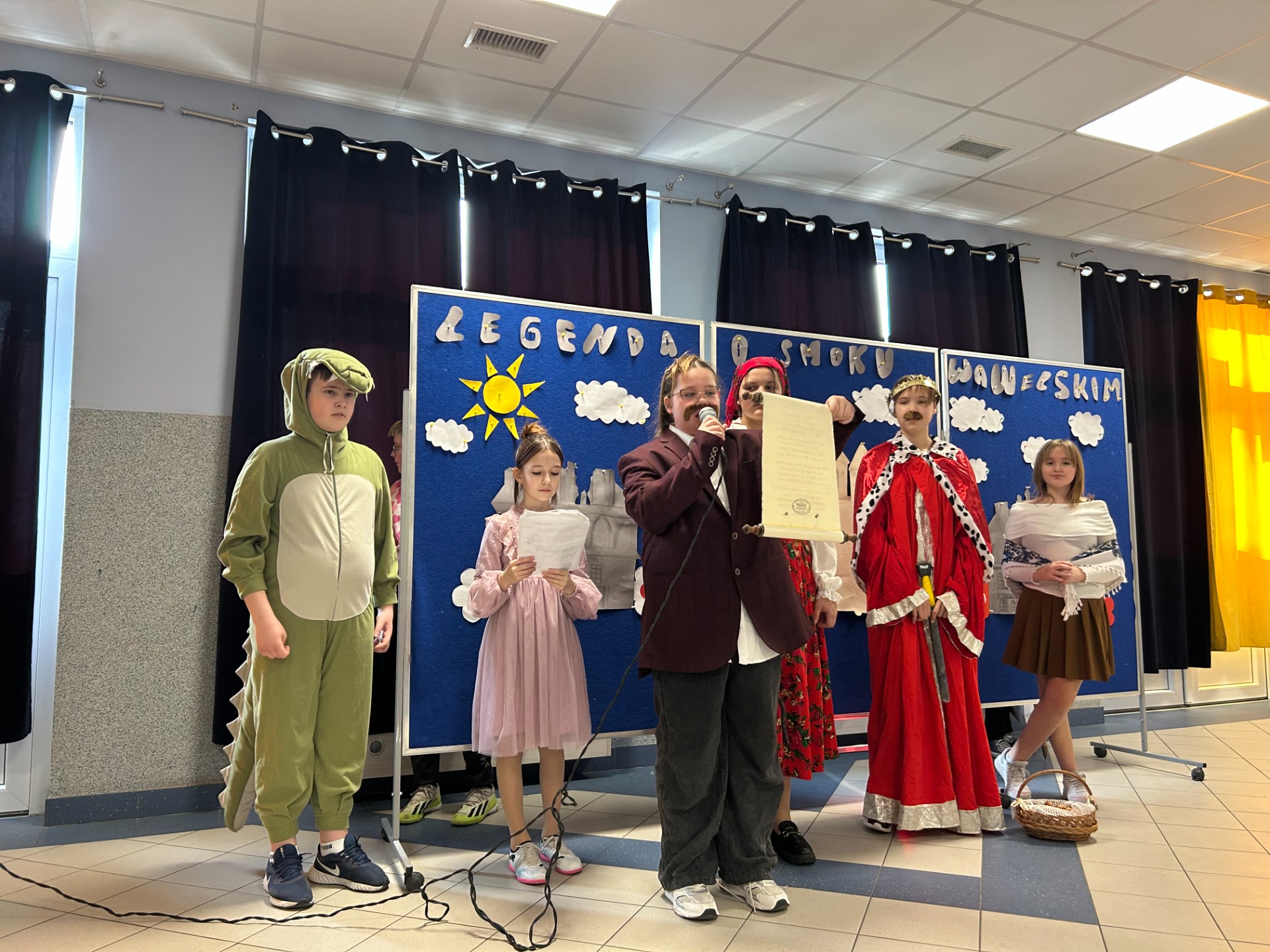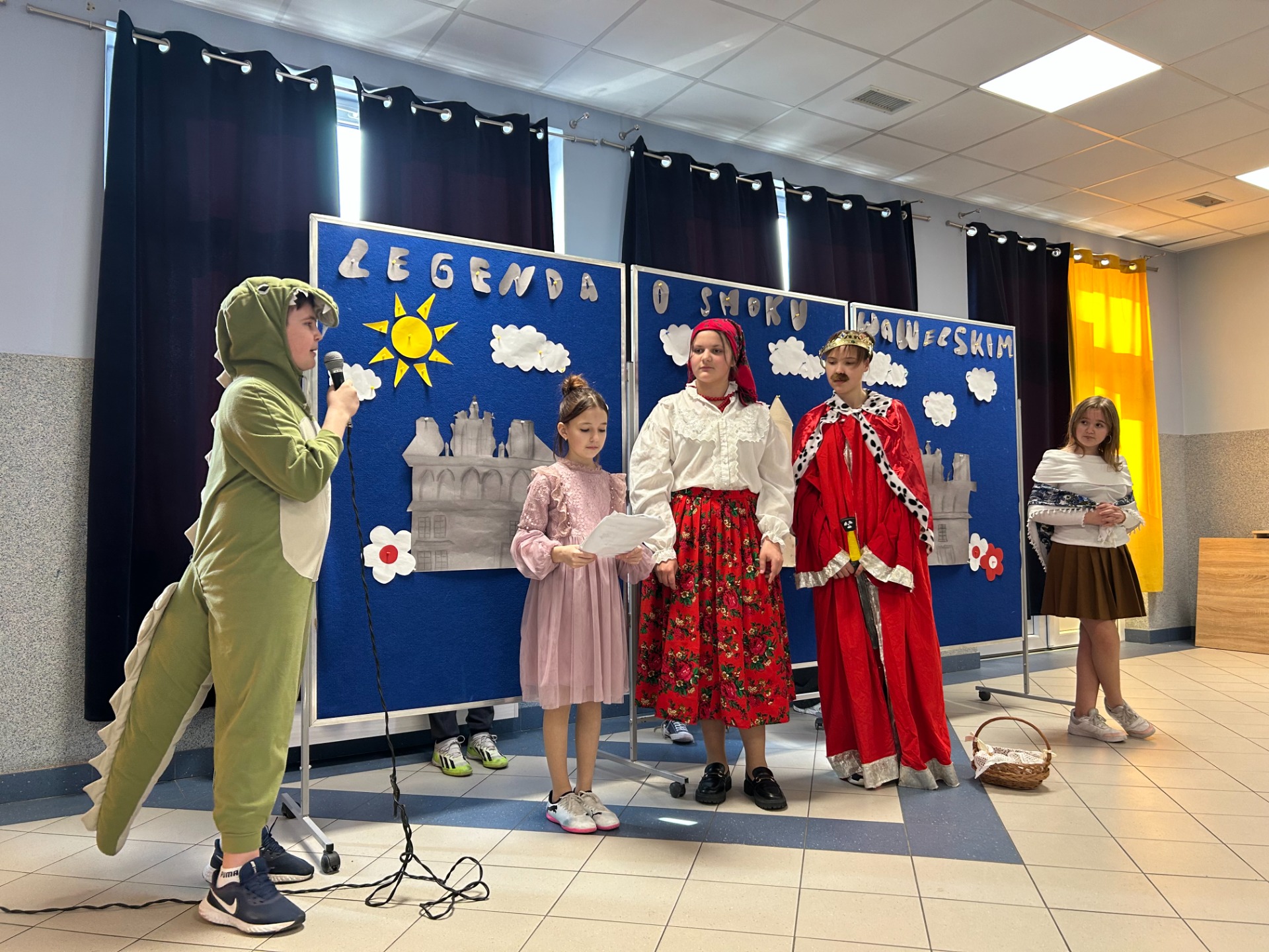 Uczniowie koła historyczno – teatralnego naszej szkoły przygotowali przedstawienie „Legenda o Smoku Wawelskim” dla klas 0-3 . Legenda opowiada o Smoku, który zamieszkał w jamie pod wawelskim grodem i siał grozę wśród mieszkańców grodu króla Kraka. Nikomu nie udało się go pokonać, dokonał tego dopiero dzielny Szewczyk Skuba.