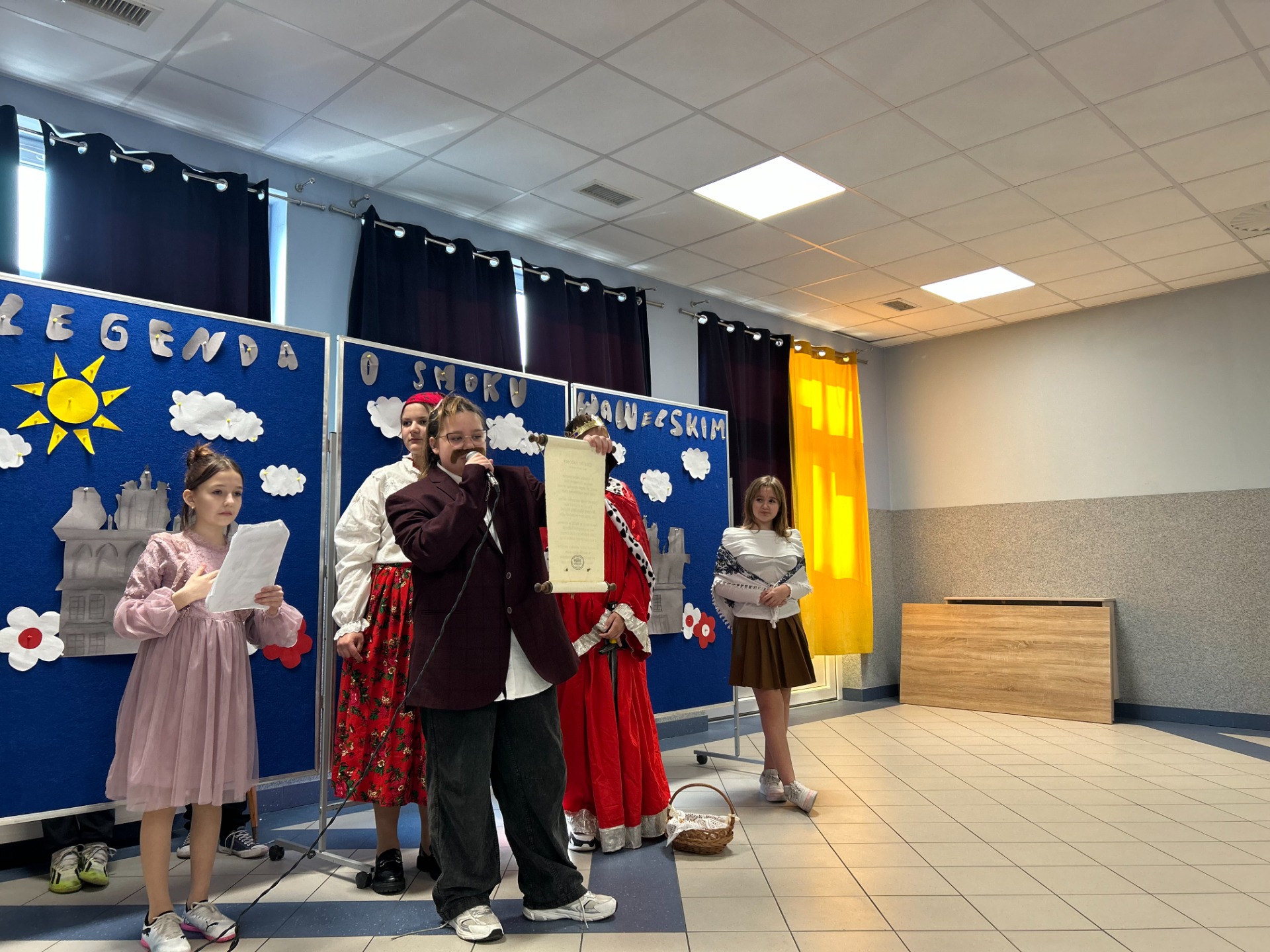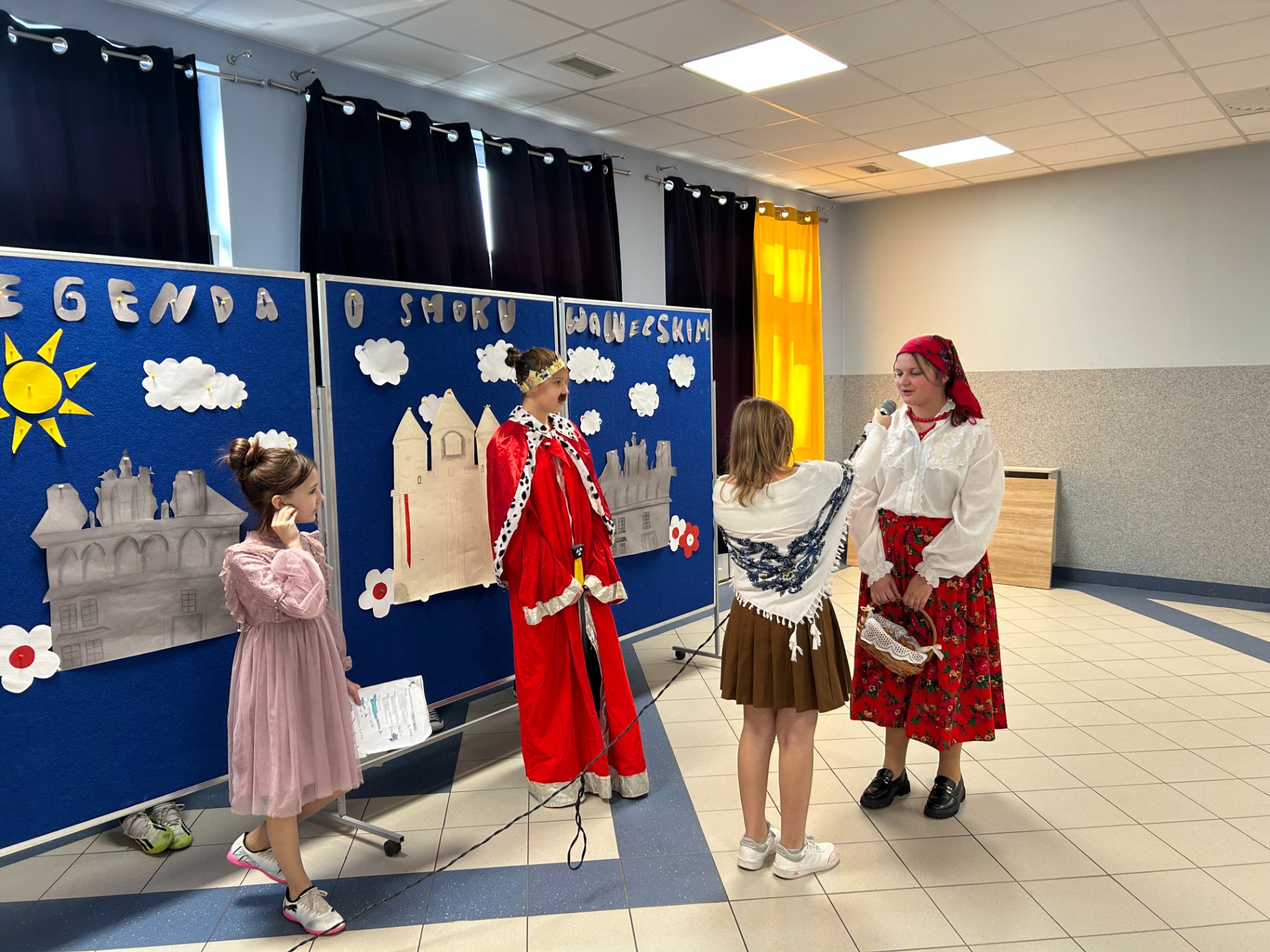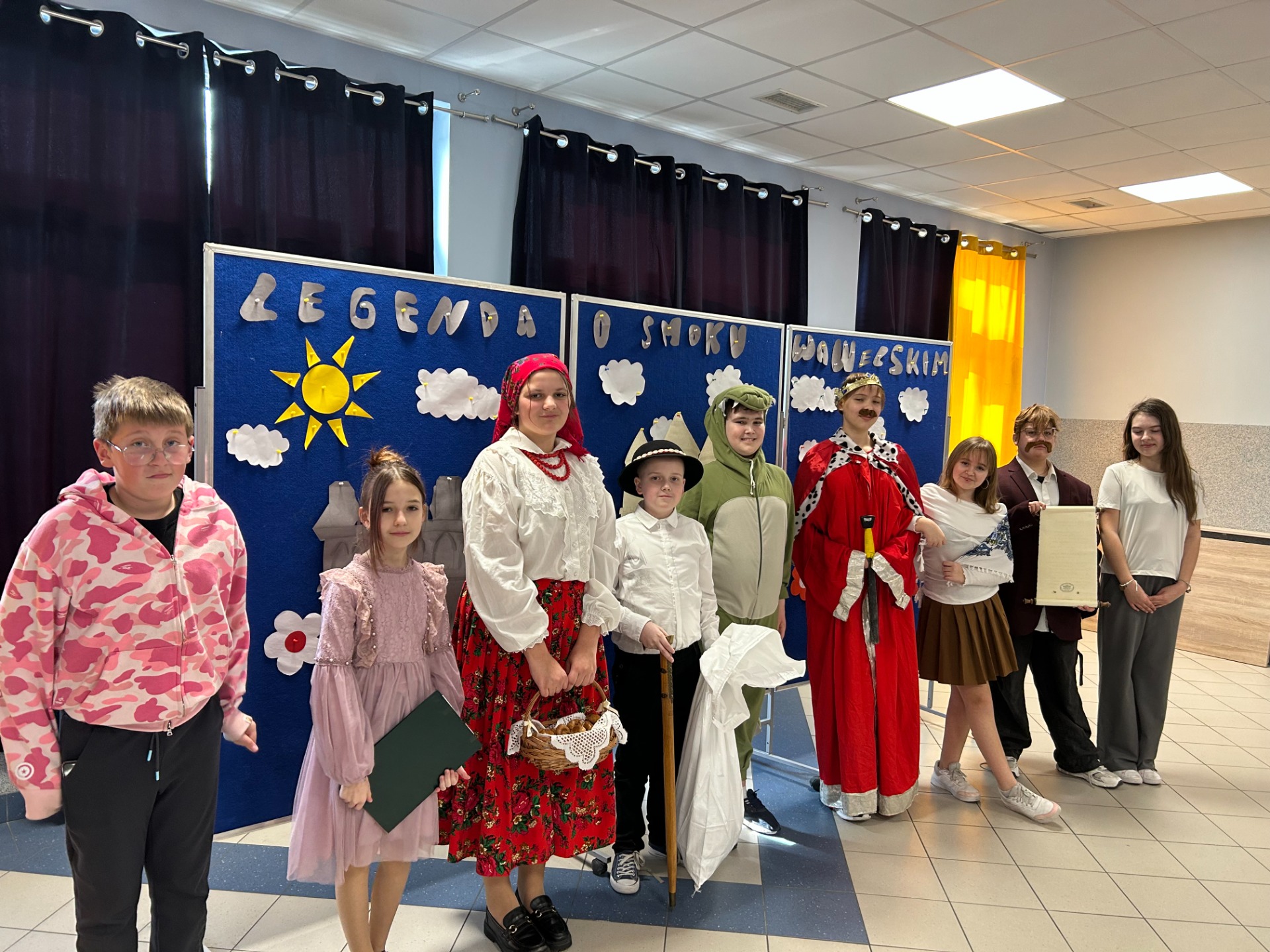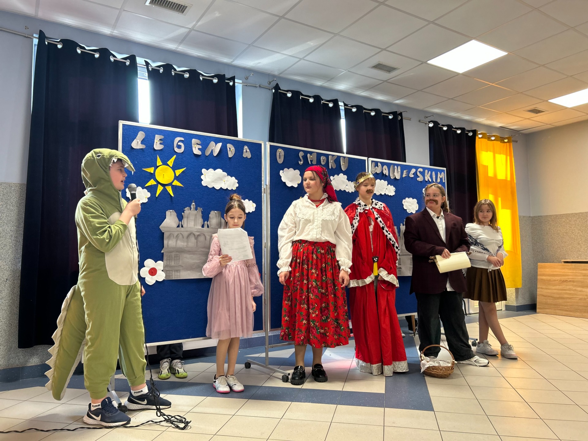 Uczniowie koła historyczno – teatralnego naszej szkoły przygotowali przedstawienie „Legenda o Smoku Wawelskim” dla klas 0-3 . Legenda opowiada o Smoku, który zamieszkał w jamie pod wawelskim grodem i siał grozę wśród mieszkańców grodu króla Kraka. Nikomu nie udało się go pokonać, dokonał tego dopiero dzielny Szewczyk Skuba.