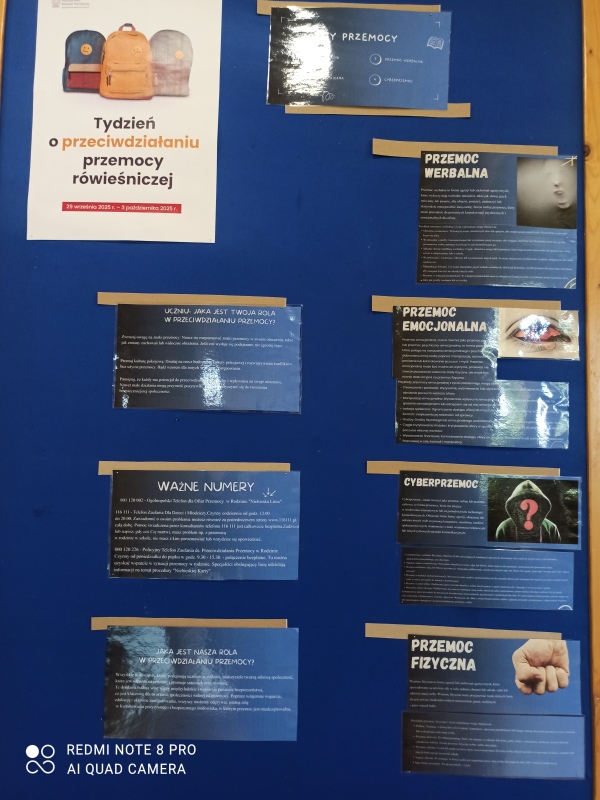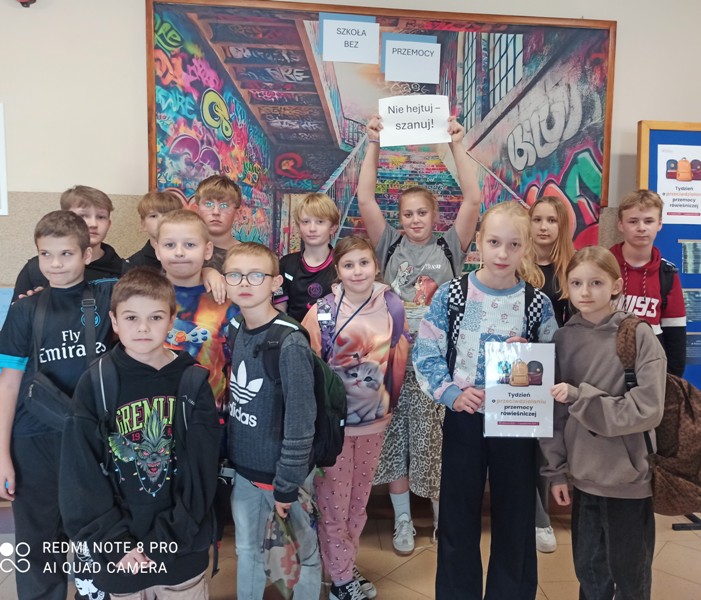 W naszej szkole odbył się Tydzień Przeciwdziałania Przemocy Rówieśniczej. Był to czas refleksji, rozmów i wspólnych działań, których celem było budowanie atmosfery szacunku, empatii i wzajemnego wsparcia. W ramach inicjatywy wychowawcy przeprowadzili zajęcia z uczniami dotyczące rozpoznawania i przeciwdziałania przemocy rówieśniczej. Na przerwach uczniowie wspólnie tworzyli Kodeks Życzliwości, przypominający o zasadach dobrego traktowania innych. Przez cały tydzień trwała akcja „Tydzień bez hejtu”, promująca kulturę słowa i odpowiedzialność za sposób komunikowania się. W piątek obchodziliśmy Dzień