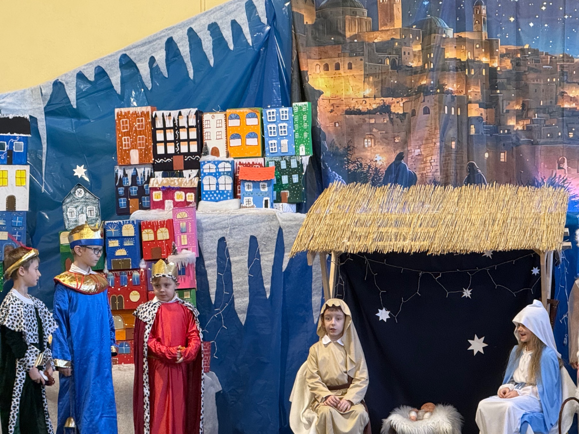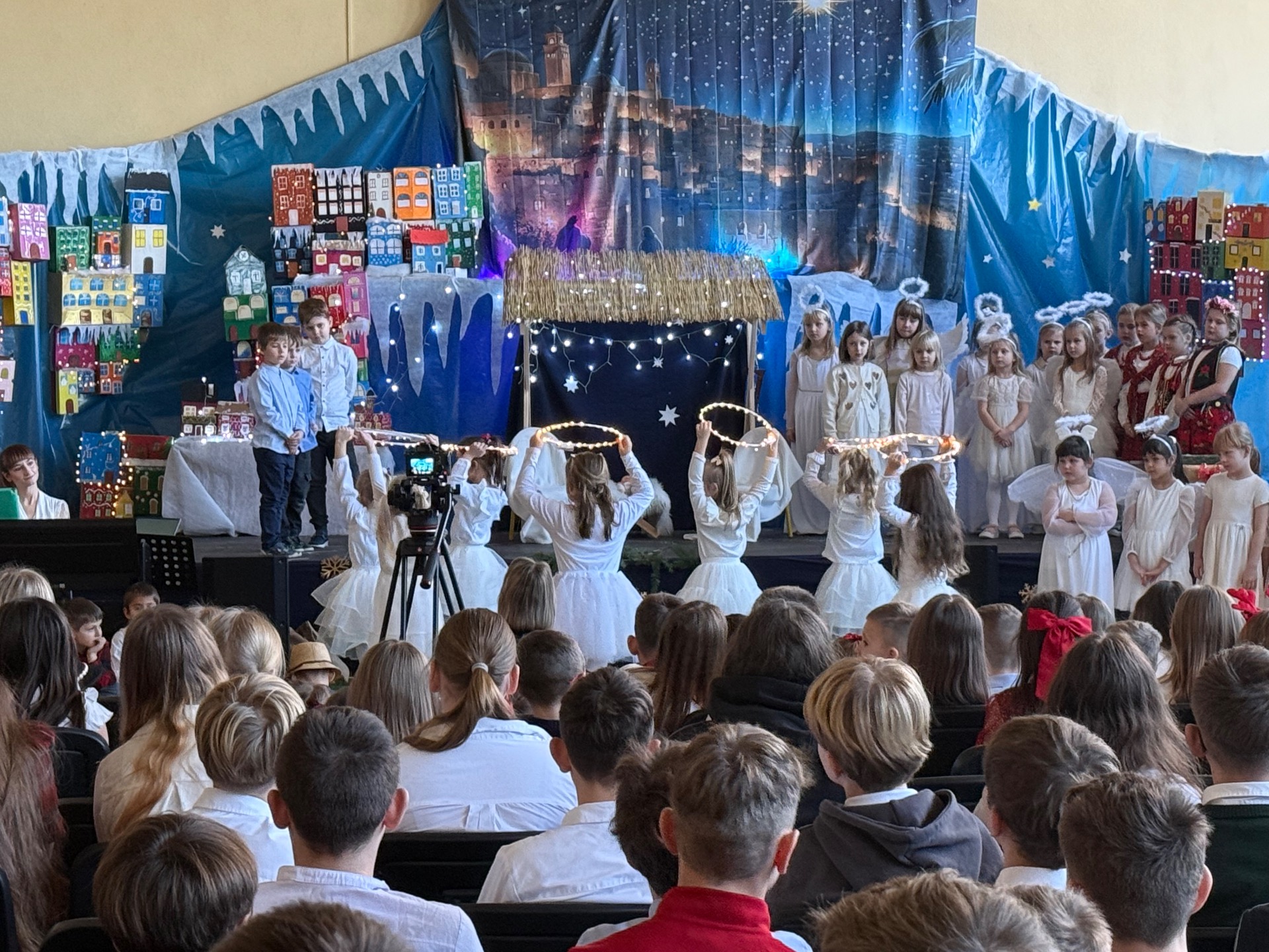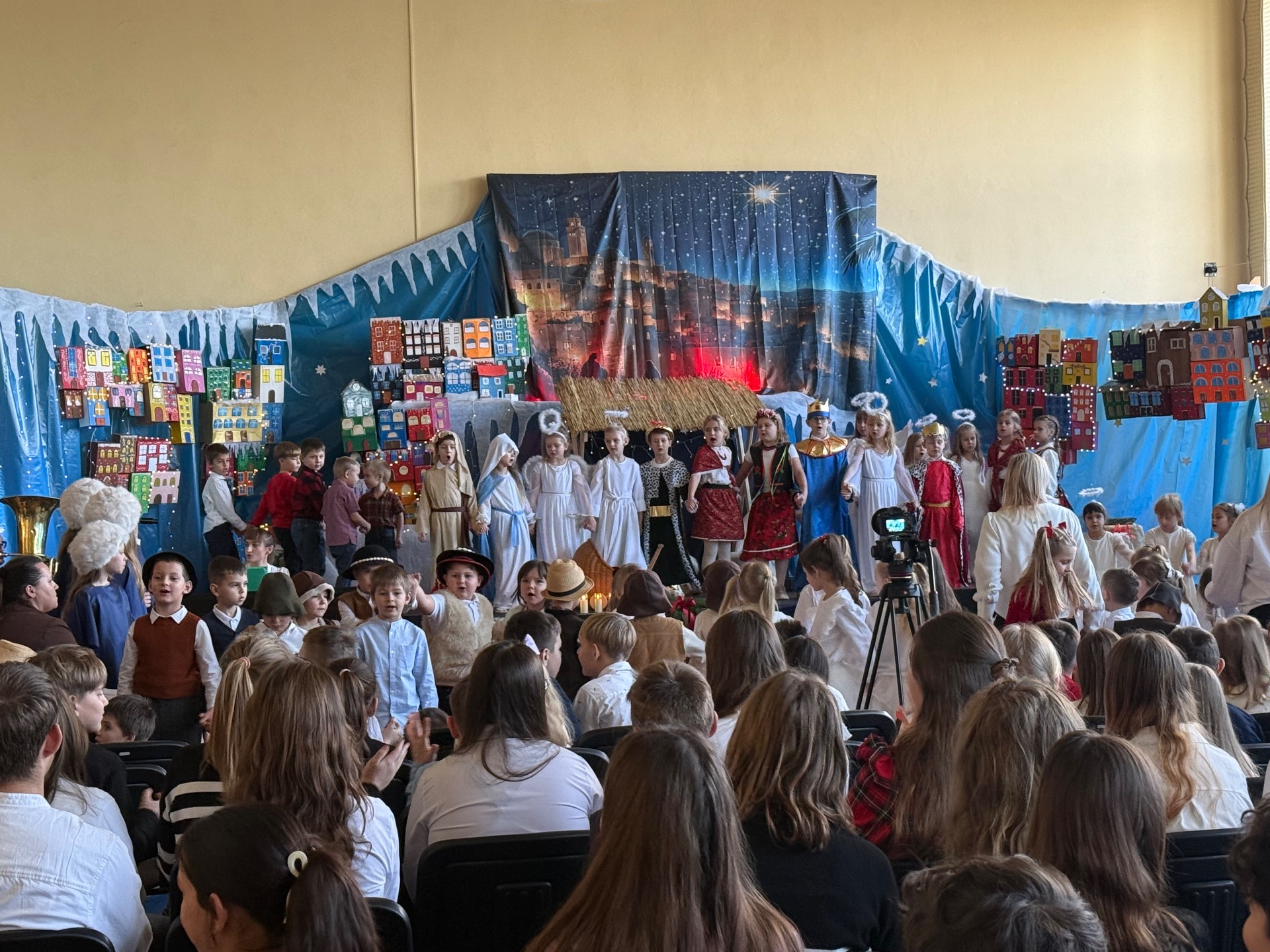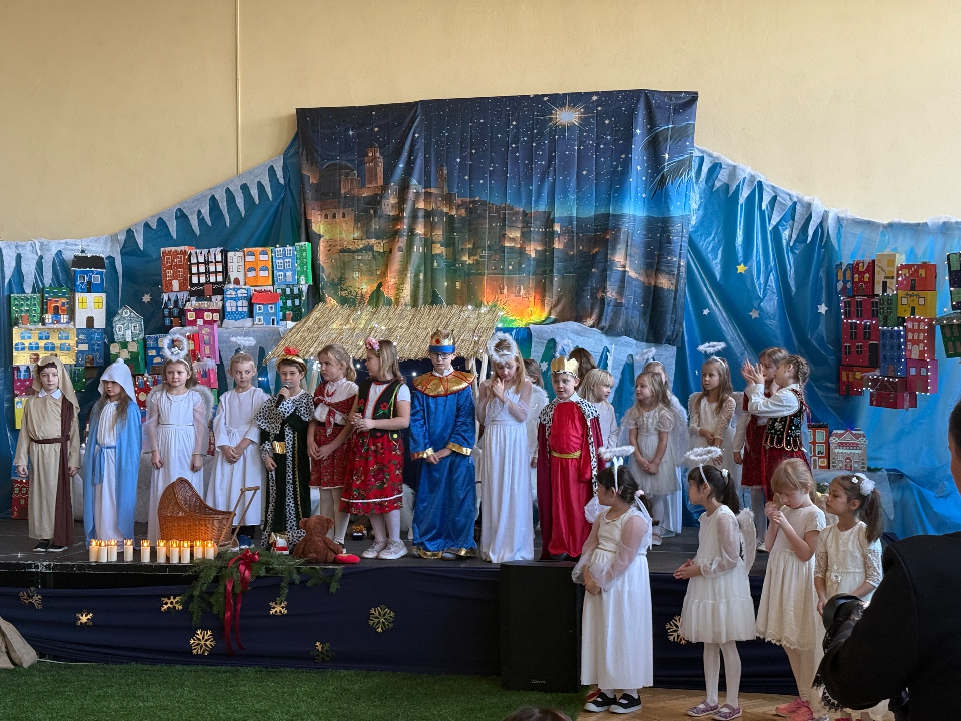 17 grudnia już od rana wszystkie klasy świętowały nadchodzące Boże Narodzenie. Świąteczna atmosfera zapanowała w całej szkole. Z sal wydobywały się dźwięki pięknych kolęd i pastorałek. Cała społeczność szkolna spotkała się w sali gimnastycznej, aby obejrzeć JASEŁKA w wykonaniu przedszkolaków, uczniów klas 0a, 0b, 1a. Do wspólnego kolędowania włączyli się uczniowie, nauczyciele, rodzice i zaproszeni goście. Artyści wprowadzili nas w świąteczny nastrój, salę zaś zdobiła piękna dekoracja. Publiczność po raz kolejny mogła przeżyć historię Marii i Józefa. Scenki z życia nowonarodzonego dzieciątka, pasterzy, mędrców, dzieci oraz aniołów przeplatane były kolędami i pastorałkami.