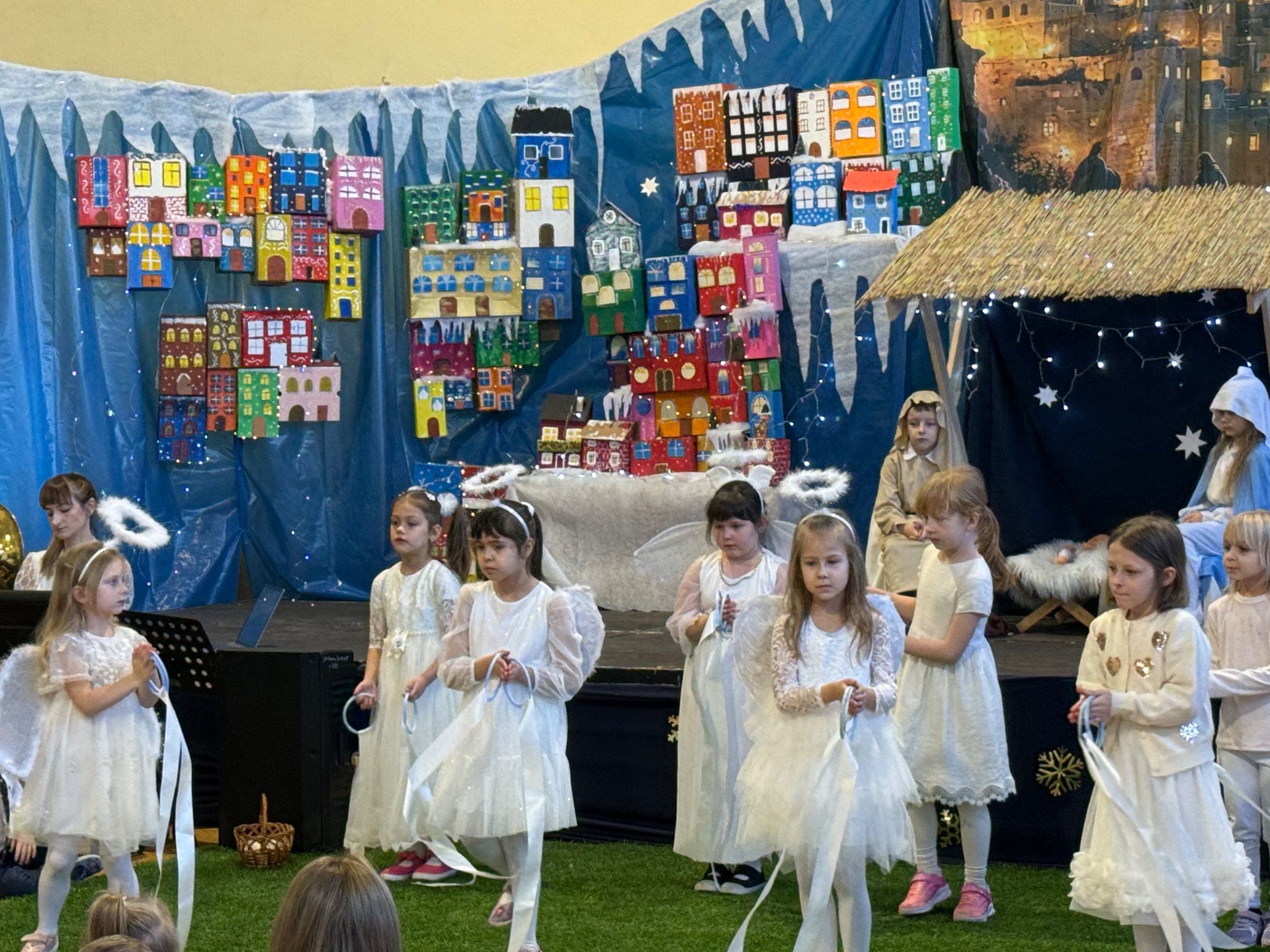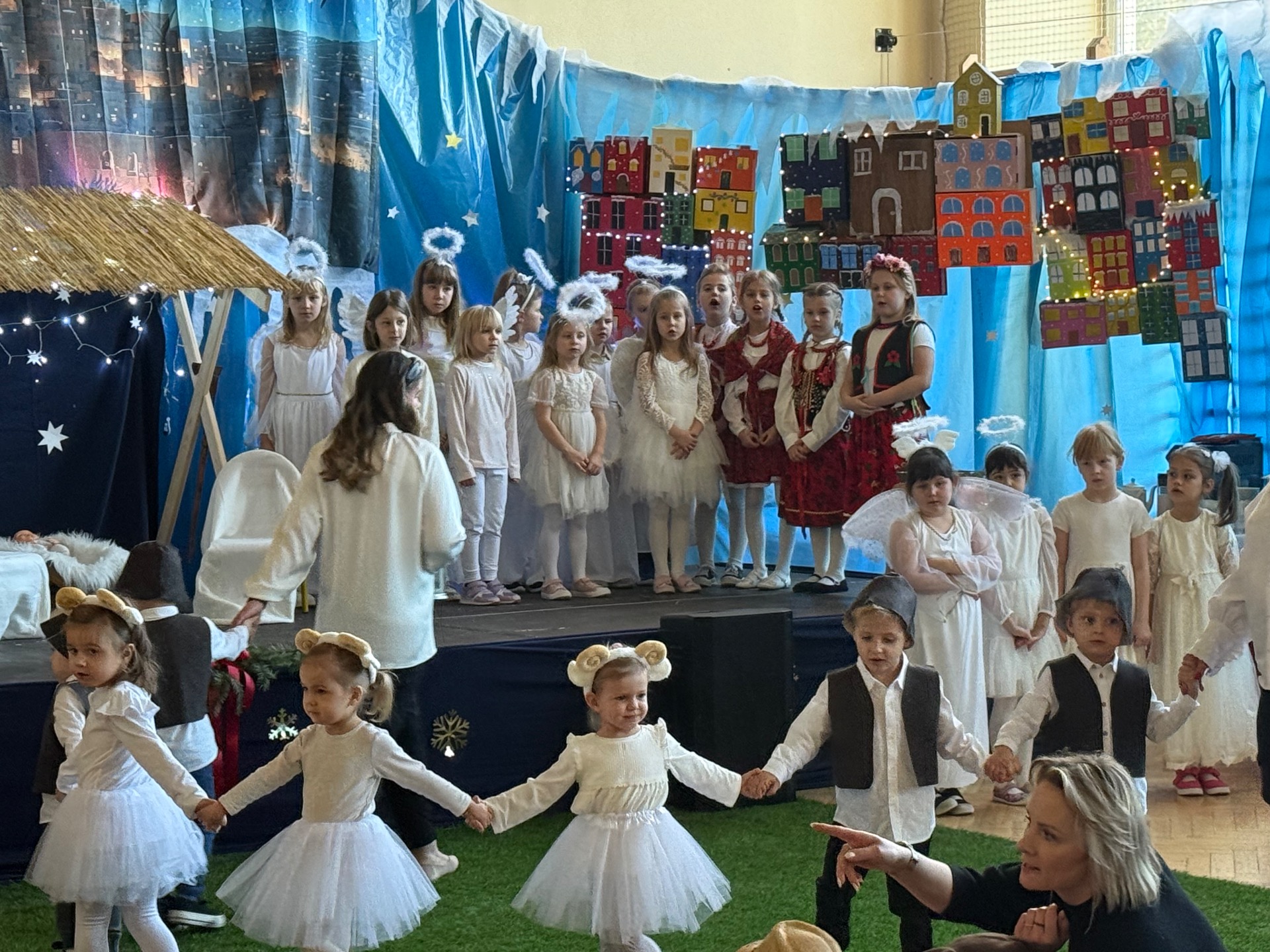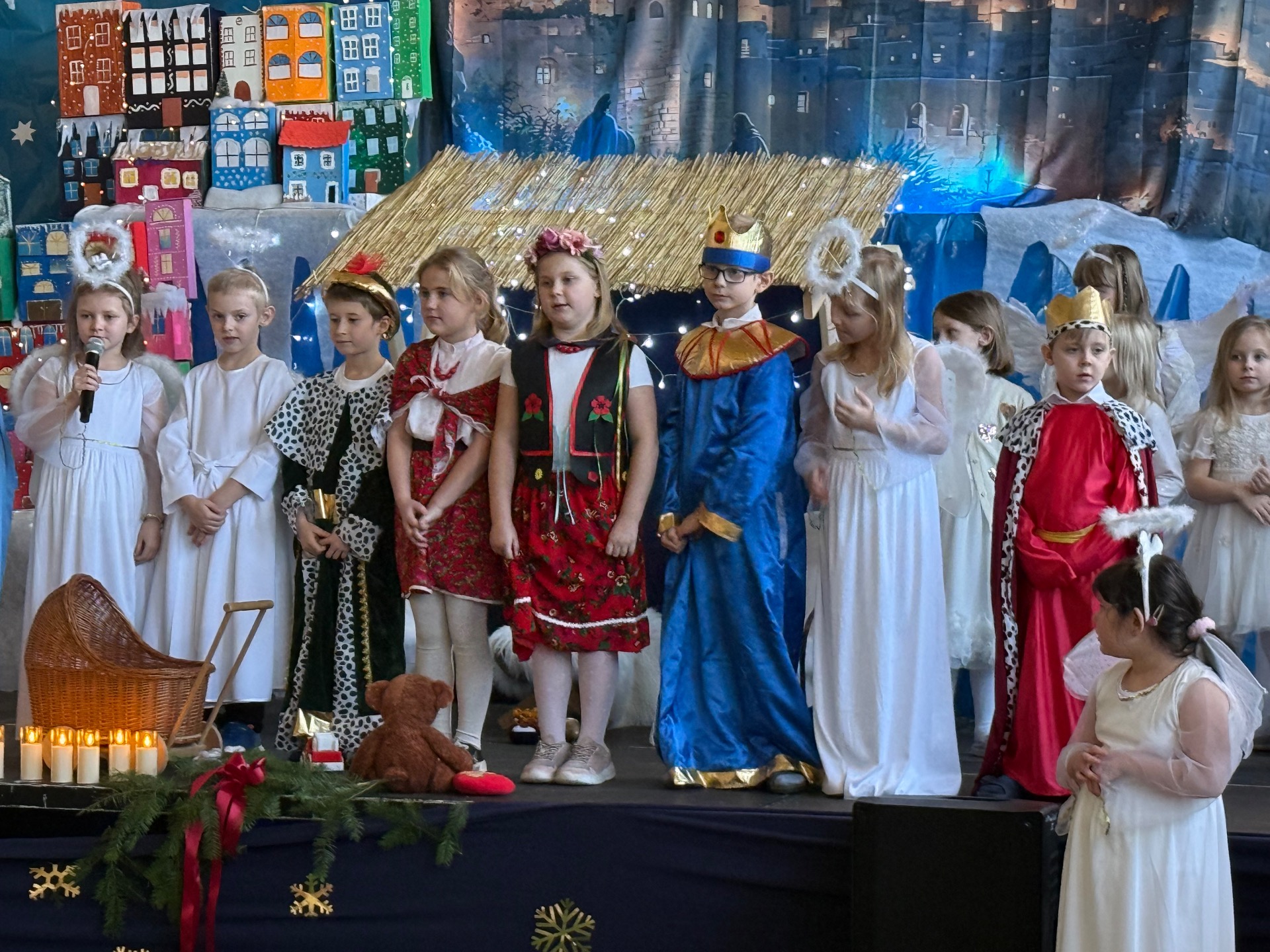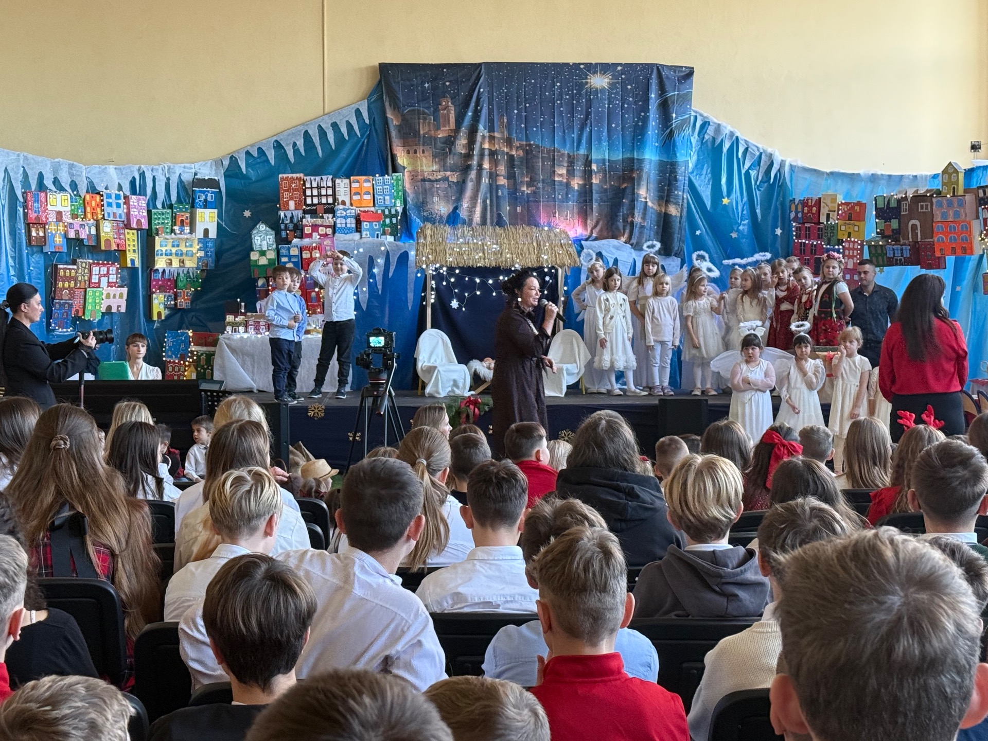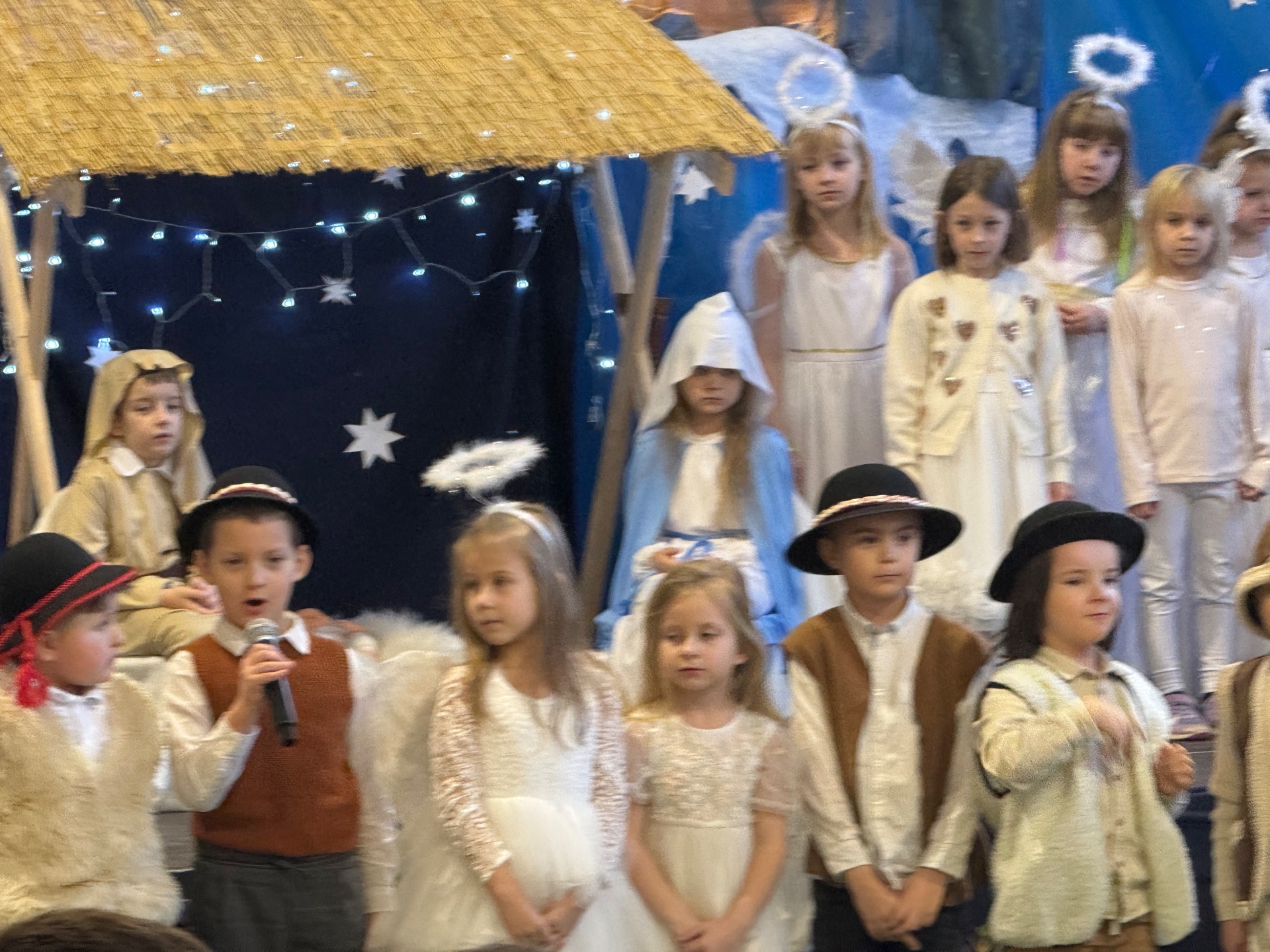 17 grudnia już od rana wszystkie klasy świętowały nadchodzące Boże Narodzenie. Świąteczna atmosfera zapanowała w całej szkole. Z sal wydobywały się dźwięki pięknych kolęd i pastorałek. Cała społeczność szkolna spotkała się w sali gimnastycznej, aby obejrzeć JASEŁKA w wykonaniu przedszkolaków, uczniów klas 0a, 0b, 1a. Do wspólnego kolędowania włączyli się uczniowie, nauczyciele, rodzice i zaproszeni goście. Artyści wprowadzili nas w świąteczny nastrój, salę zaś zdobiła piękna dekoracja. Publiczność po raz kolejny mogła przeżyć historię Marii i Józefa. Scenki z życia nowonarodzonego dzieciątka, pasterzy, mędrców, dzieci oraz aniołów przeplatane były kolędami i pastorałkami.