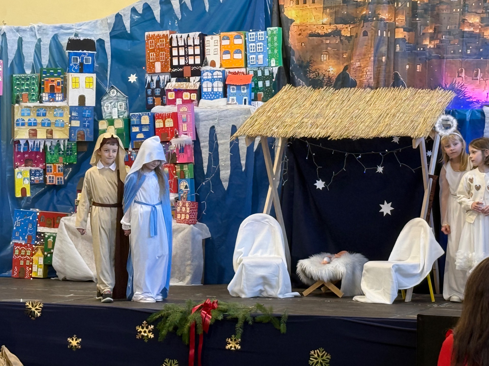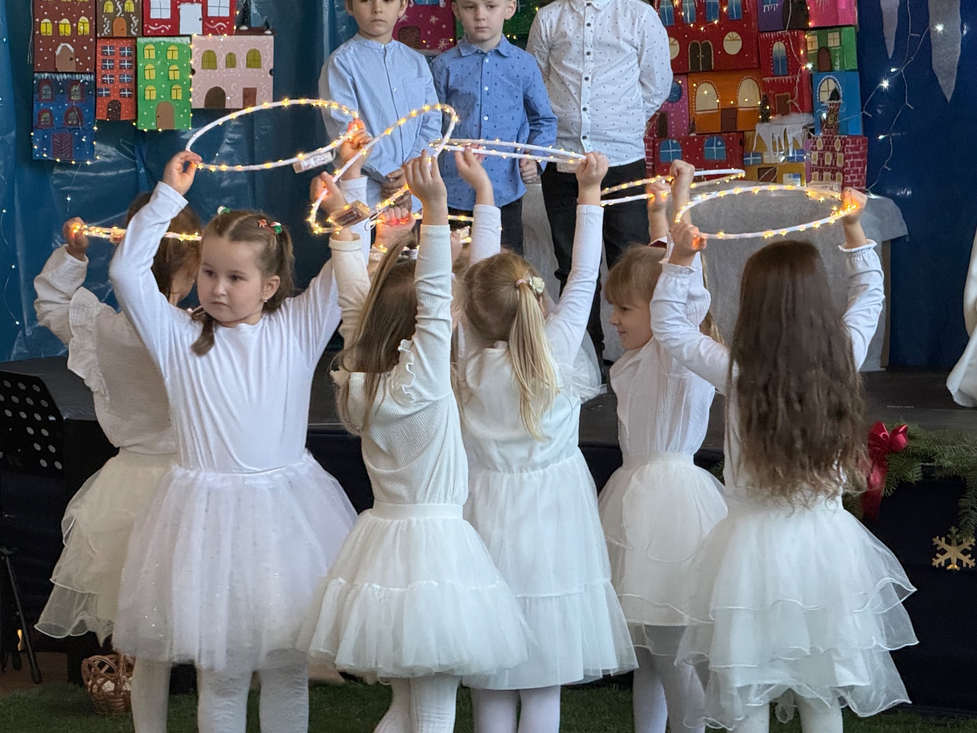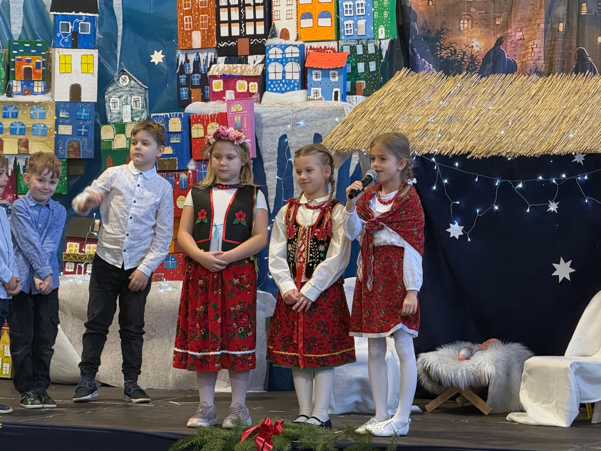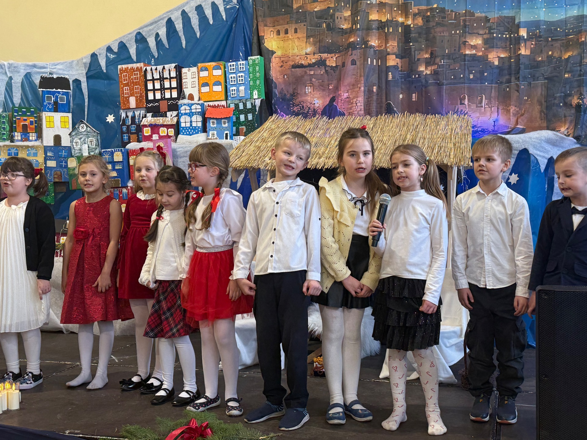 17 grudnia już od rana wszystkie klasy świętowały nadchodzące Boże Narodzenie. Świąteczna atmosfera zapanowała w całej szkole. Z sal wydobywały się dźwięki pięknych kolęd i pastorałek. Cała społeczność szkolna spotkała się w sali gimnastycznej, aby obejrzeć JASEŁKA w wykonaniu przedszkolaków, uczniów klas 0a, 0b, 1a. Do wspólnego kolędowania włączyli się uczniowie, nauczyciele, rodzice i zaproszeni goście. Artyści wprowadzili nas w świąteczny nastrój, salę zaś zdobiła piękna dekoracja. Publiczność po raz kolejny mogła przeżyć historię Marii i Józefa. Scenki z życia nowonarodzonego dzieciątka, pasterzy, mędrców, dzieci oraz aniołów przeplatane były kolędami i pastorałkami.