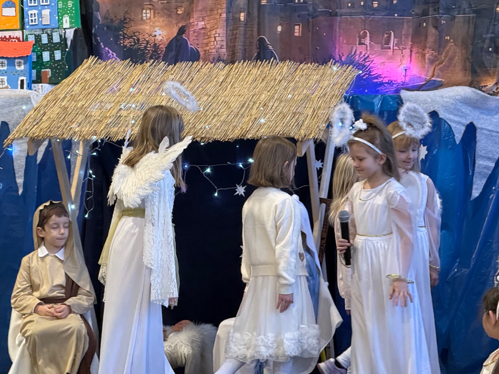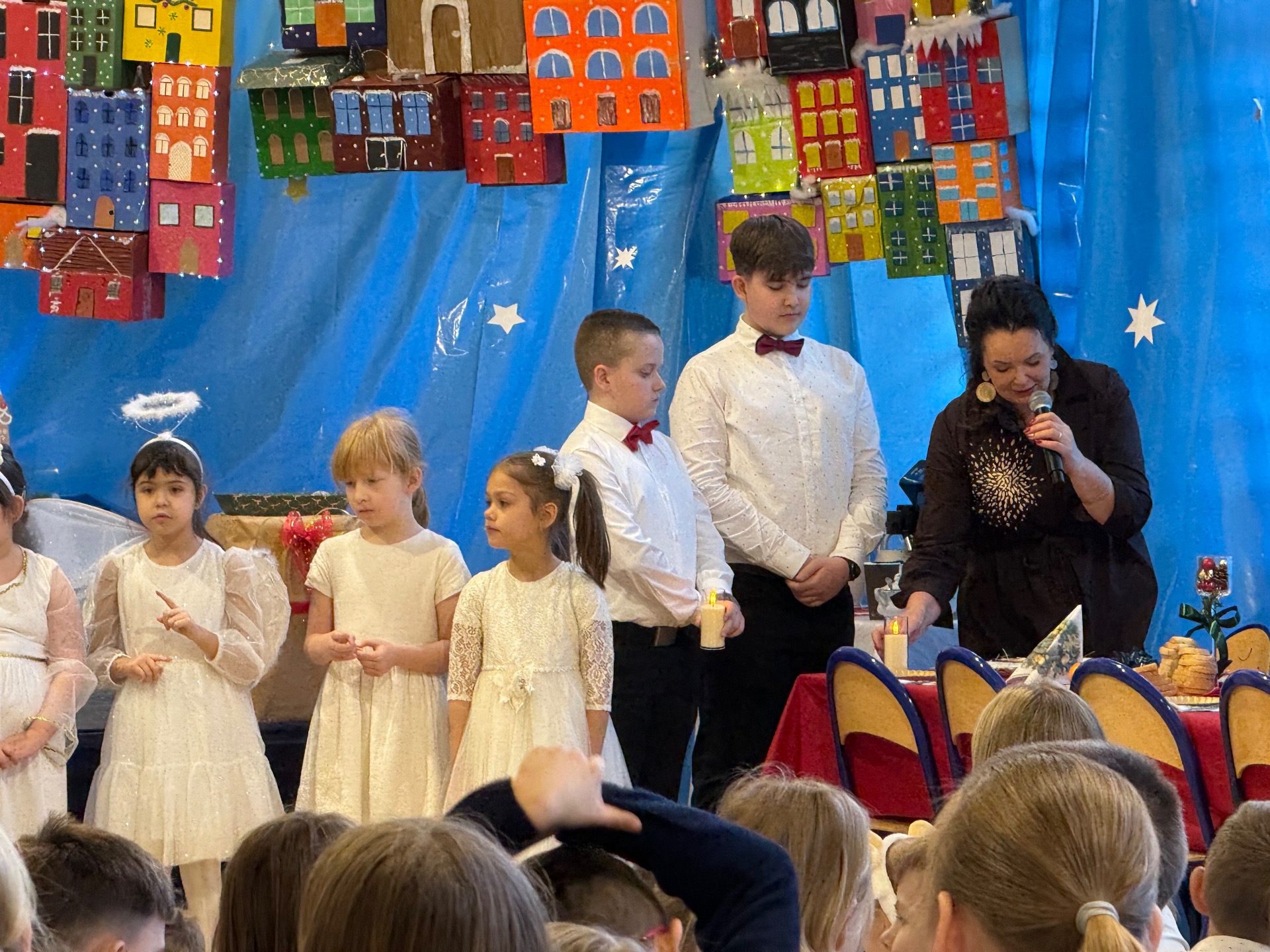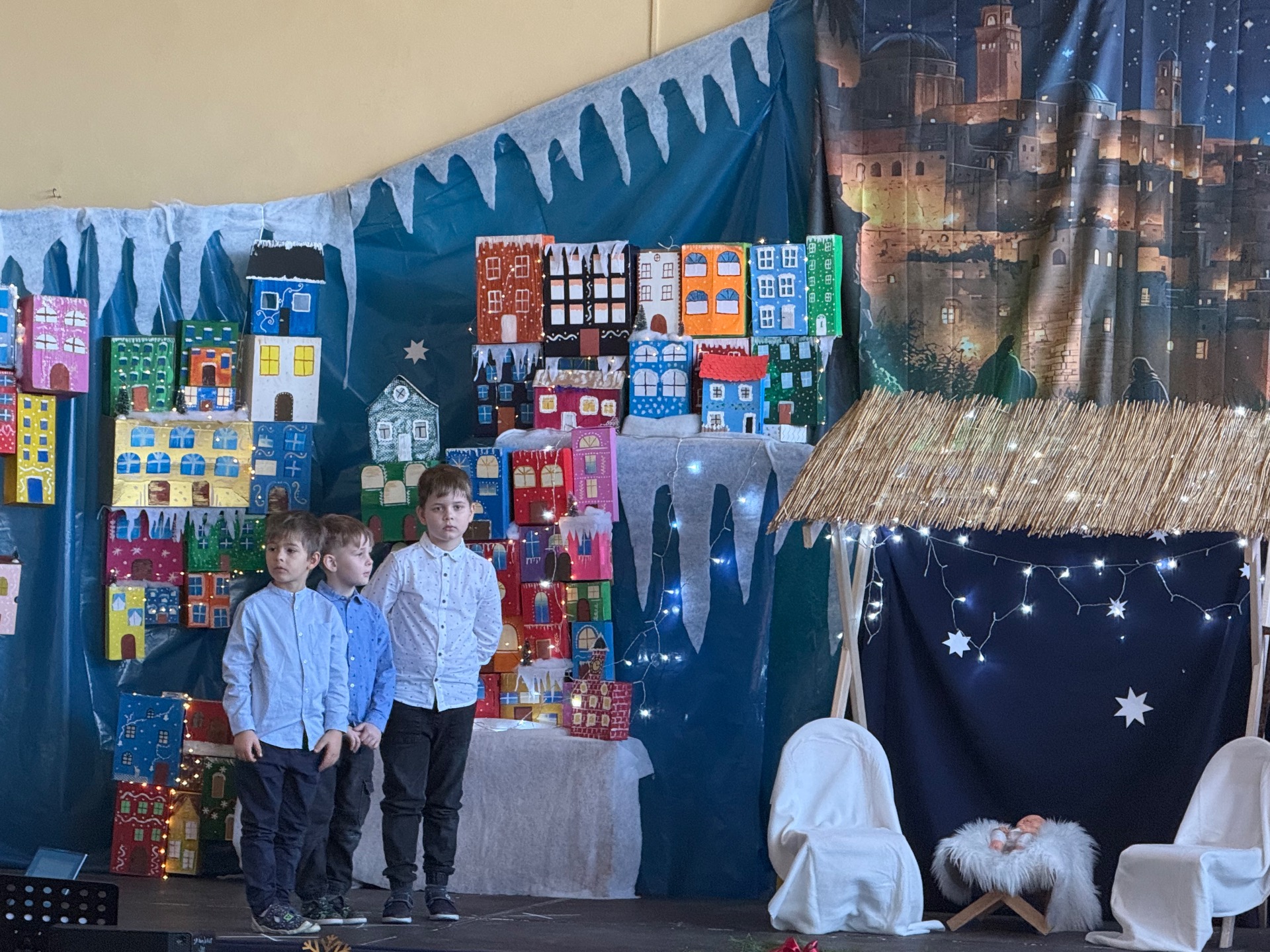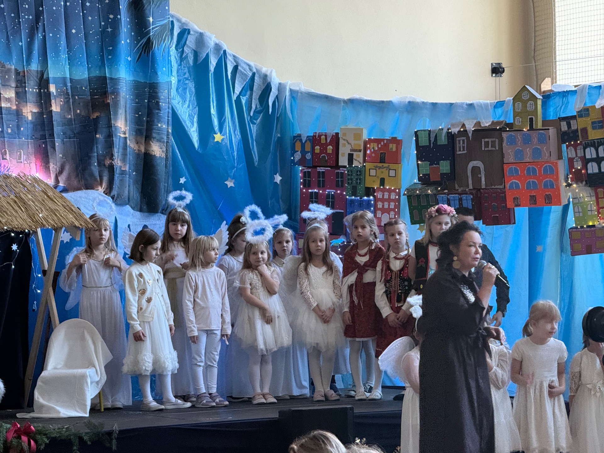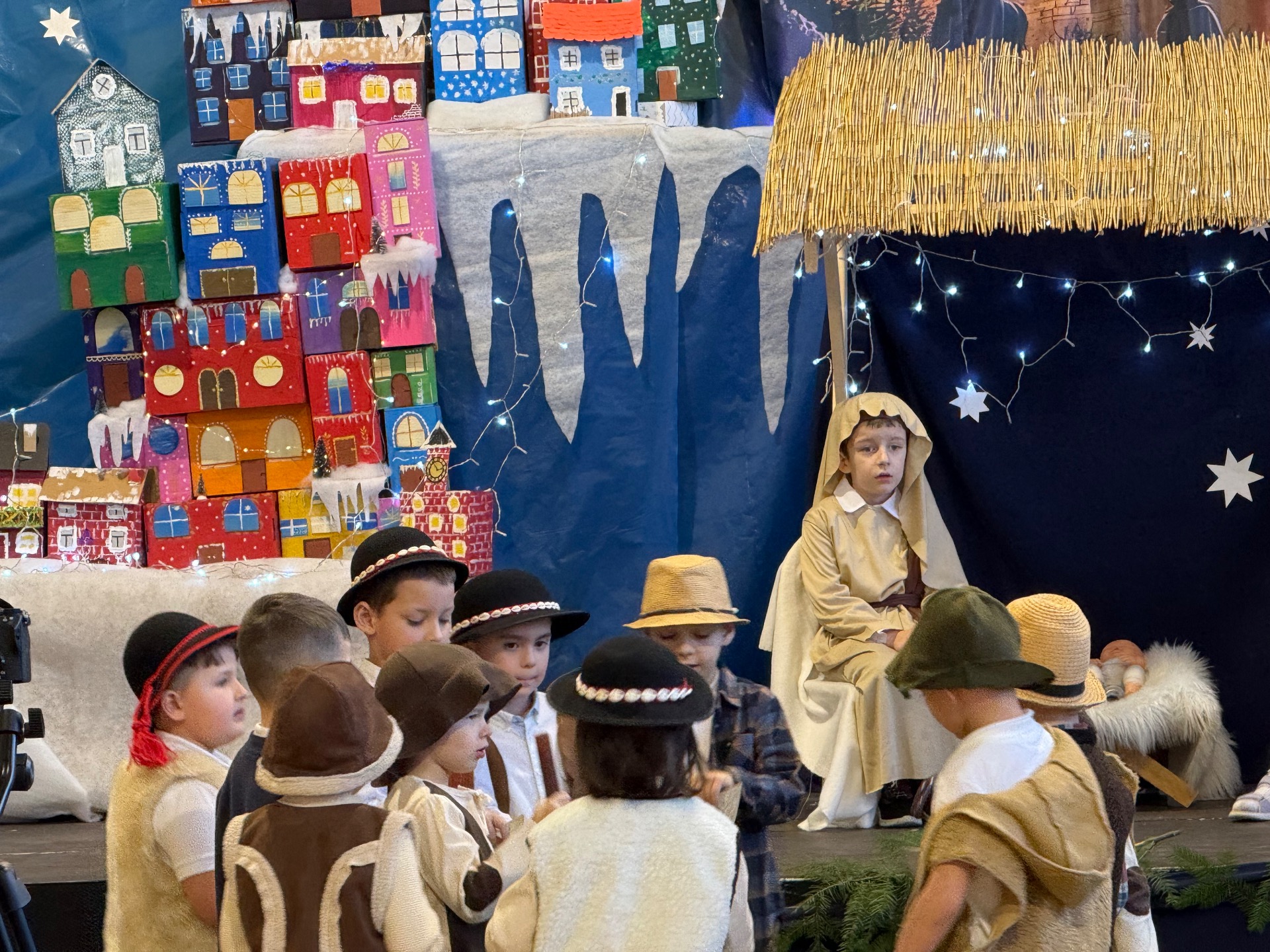 17 grudnia już od rana wszystkie klasy świętowały nadchodzące Boże Narodzenie. Świąteczna atmosfera zapanowała w całej szkole. Z sal wydobywały się dźwięki pięknych kolęd i pastorałek. Cała społeczność szkolna spotkała się w sali gimnastycznej, aby obejrzeć JASEŁKA w wykonaniu przedszkolaków, uczniów klas 0a, 0b, 1a. Do wspólnego kolędowania włączyli się uczniowie, nauczyciele, rodzice i zaproszeni goście. Artyści wprowadzili nas w świąteczny nastrój, salę zaś zdobiła piękna dekoracja. Publiczność po raz kolejny mogła przeżyć historię Marii i Józefa. Scenki z życia nowonarodzonego dzieciątka, pasterzy, mędrców, dzieci oraz aniołów przeplatane były kolędami i pastorałkami.