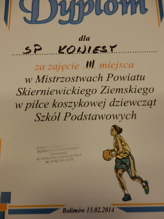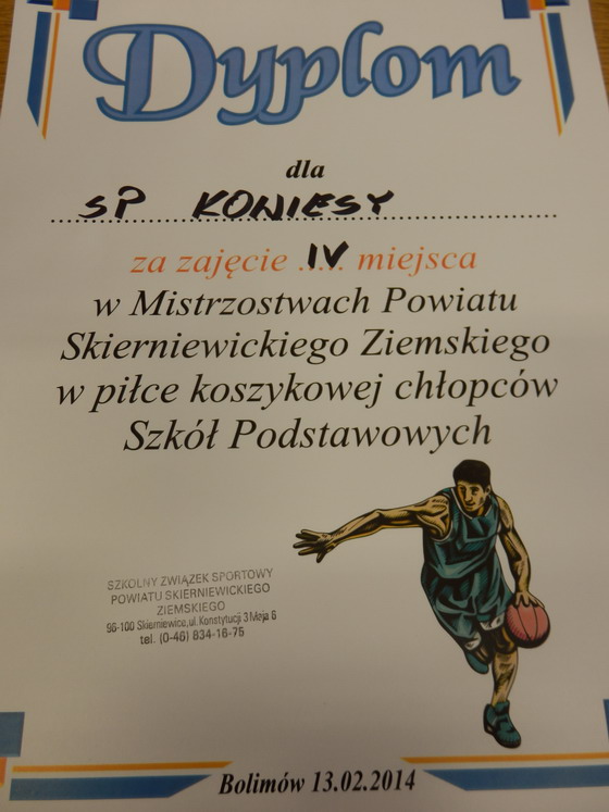 W dniu 13. 02. 2014r. uczniowie naszej szkoły wzięli udział w Mistrzostwach Powiatu Skierniewickiego Ziemskiego w piłce koszykowej dziewcząt i chłopców Szkół Podstawowych w Nowym Dworze. Po ciężkich bojach drużyna dziewcząt zajęła III miejsce, a drużyna chłopców IV. Gratulujemy!!!