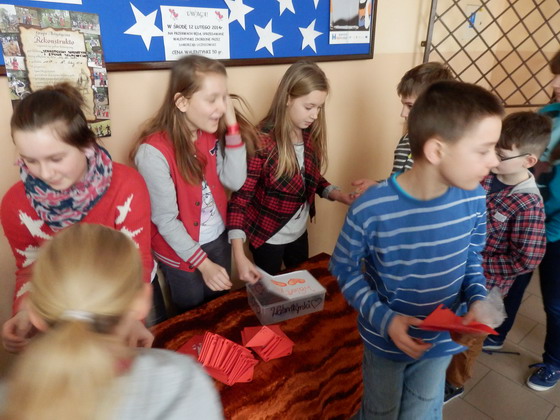 W piątek 14 lutego obchodzony był w naszej szkole Dzień Świętego Walentego, czyli popularne Walentynki - Święto Zakochanych. W związku z tym przez cały tydzień panował w naszej szkole Walentynkowy nastrój, a było tak za sprawą Samorządu Uczniowskiego. Samorząd przygotował kartki walentynkowe, które były sprzedawane na przerwach. Ponadto, 14 lutego odbył się Międzyklasowy Konkurs Walentynkowy, którego celem była rywalizacja międzyklasowa oraz integracja zespołów klasowych. Zadanie polegało na zaakcentowaniu Dnia Zakochanych ubiorem w kolorze czerwonym, ponieważ ta właśnie barwa nieodłącznie symbolizuje miłość. Pierwsze miejsce zajęła klasa V i I „b” W nagrodę klasom wręczono słodycze.