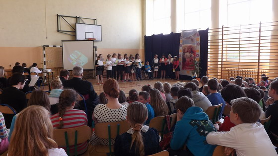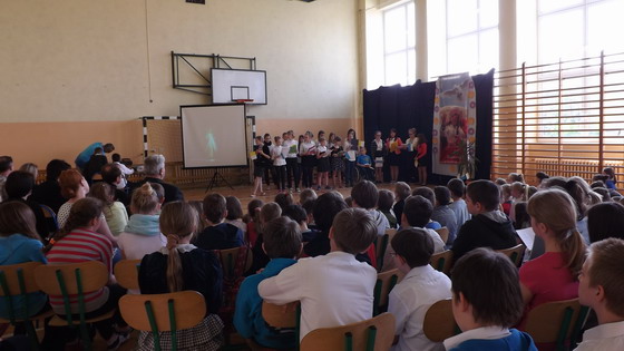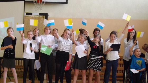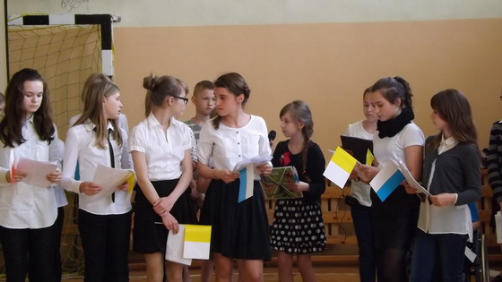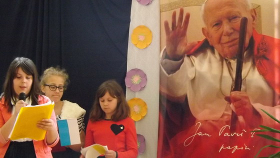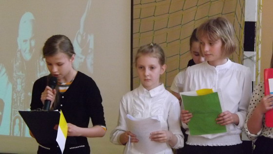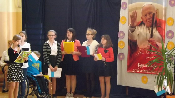 25 kwietnia uczniowie klasy IV oraz VI pod kierunkiem pani Ireny Stańczak przygotowali niezwykle wzruszającą akademię pt. „Nie lękajcie się”, aby uczcić kanonizację Jana Pawła II. Dzięki niej wszyscy przypomnieli sobie najważniejsze fakty z życia Ojca Świętego: od narodzin poprzez dzieciństwo, święcenia kapłańskie, wybór na Stolicę Piotrową. Jednak jak pokazała inscenizacja, słowa Papieża nie odeszły, pozostały w pamięci i nadal są drogowskazem dla tych, którzy chcą naprawdę żyć i być szczęśliwymi, ponieważ „Świętość to miłość, wolność, prawda.”