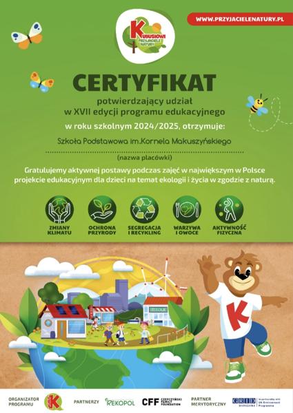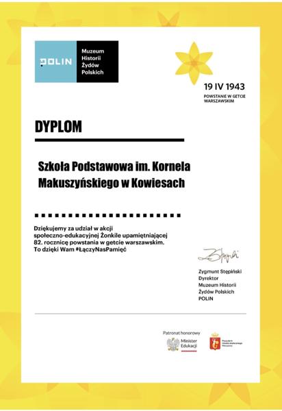 22 maja 2025 Rok szkolny 2024/2025 Dyplom za udział w akcji „Żonkile” Nasza szkoła otrzymała dyplom za udział w akcji społeczno – edukacyjnej Żonkile, upamiętniającej 82 rocznicę powstania w getcie warszawskim, orgaznizowanej przez Muzeum Historii Żydów... Czytaj więcej